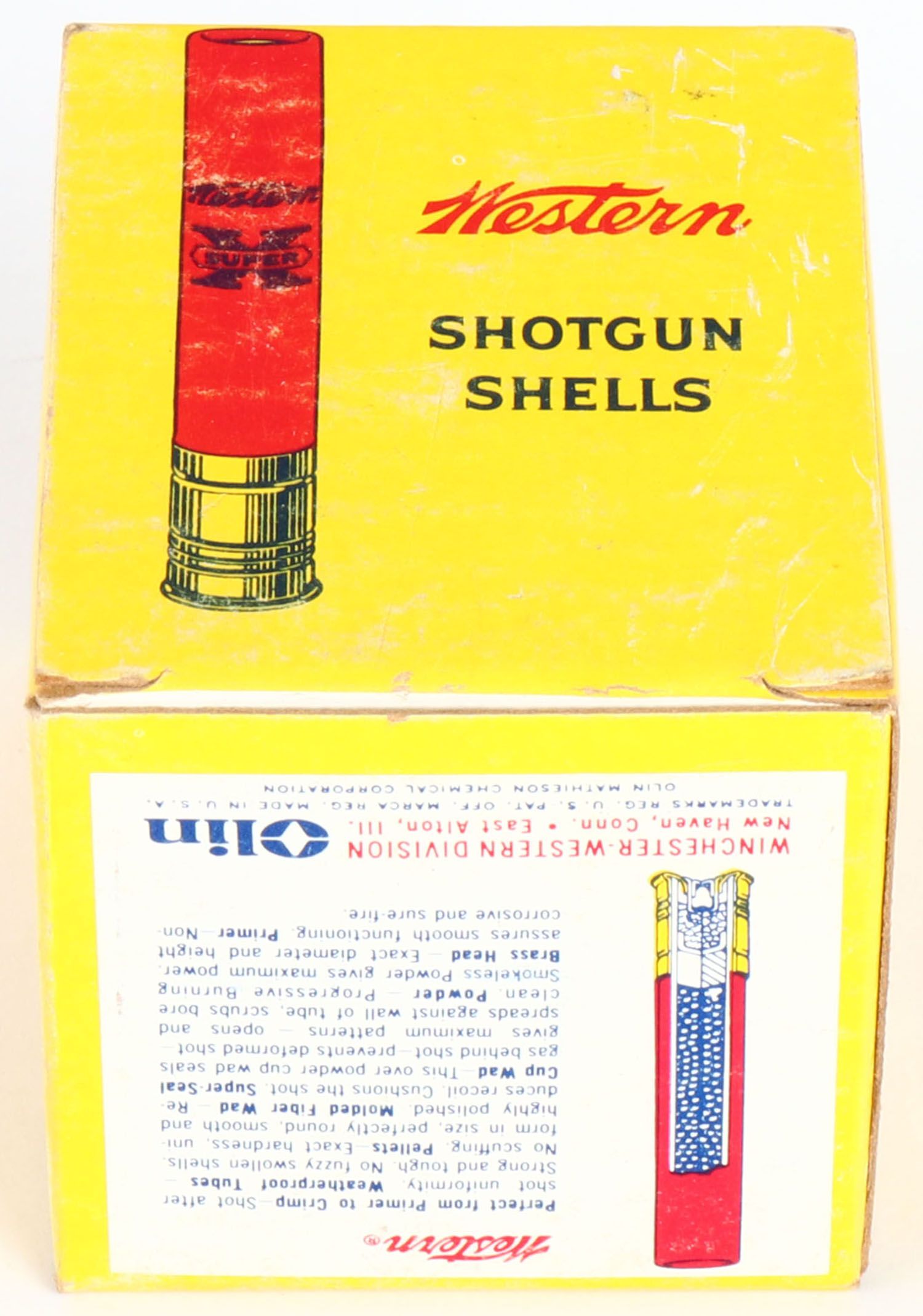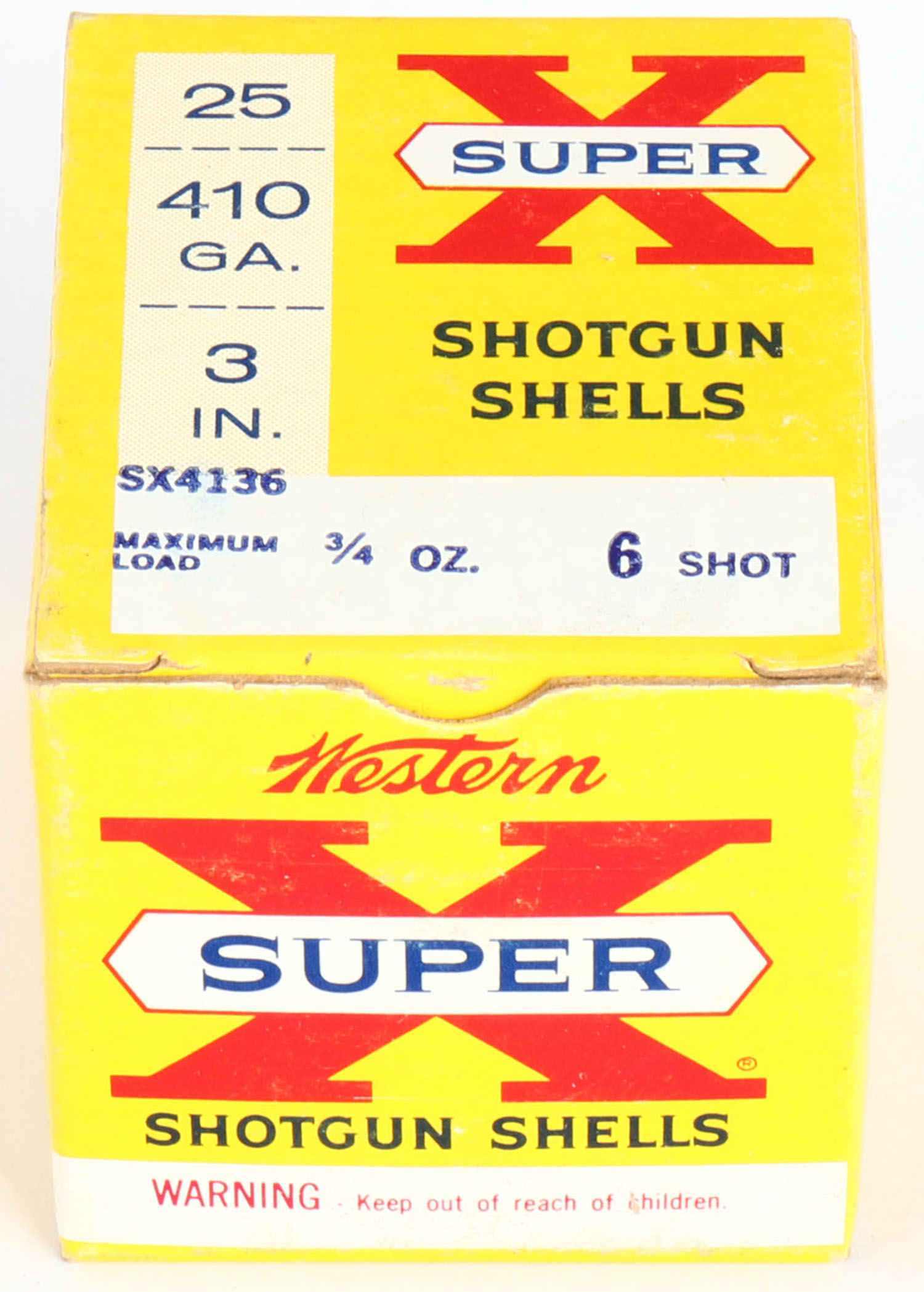Western, Super X, 410ga., 1pc., Full, shot size 6, 3'', multi-colored box, box is very solid with great color, shells are excellent. Grade: Excellent + - Value: 10 to 40