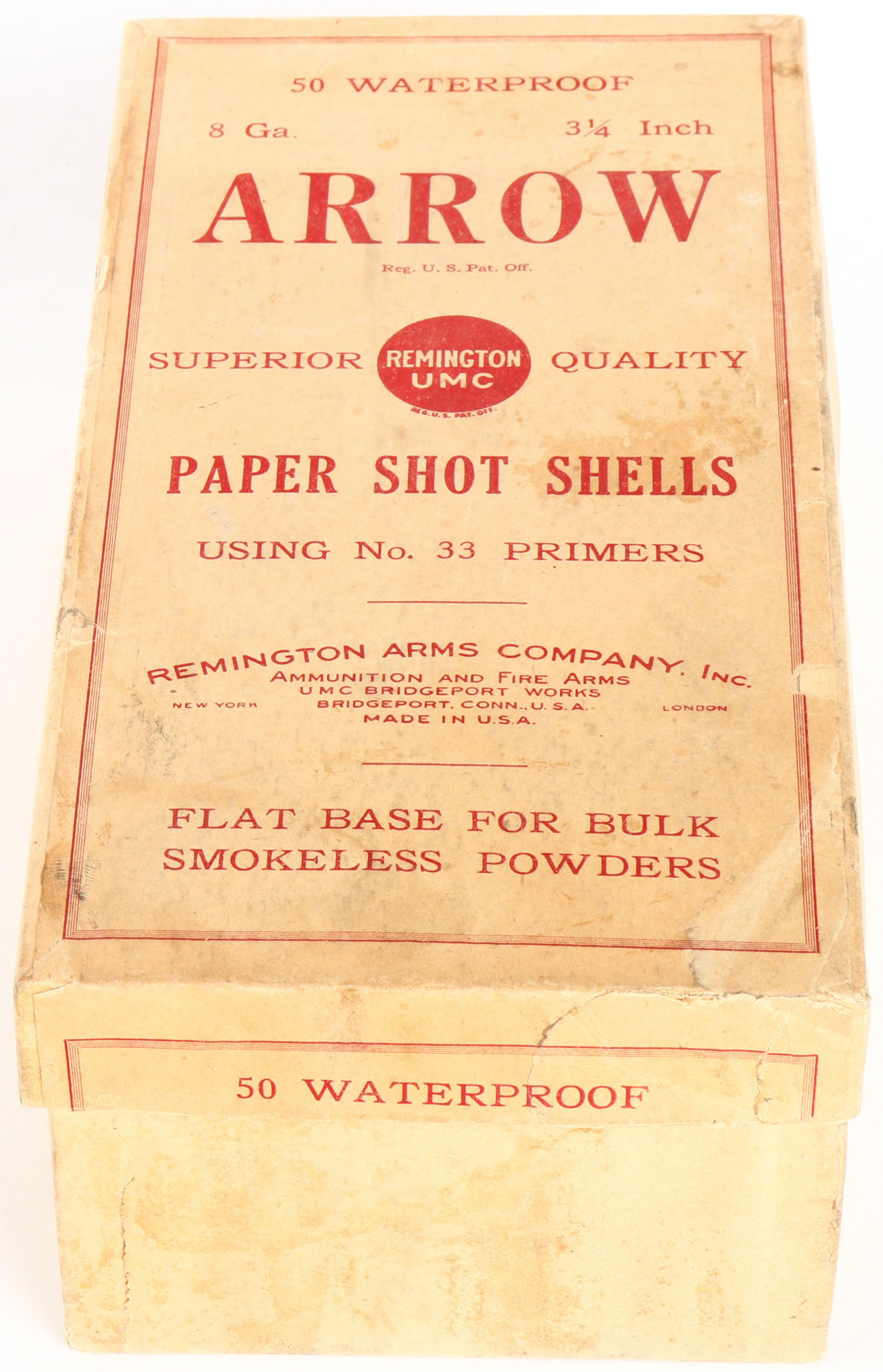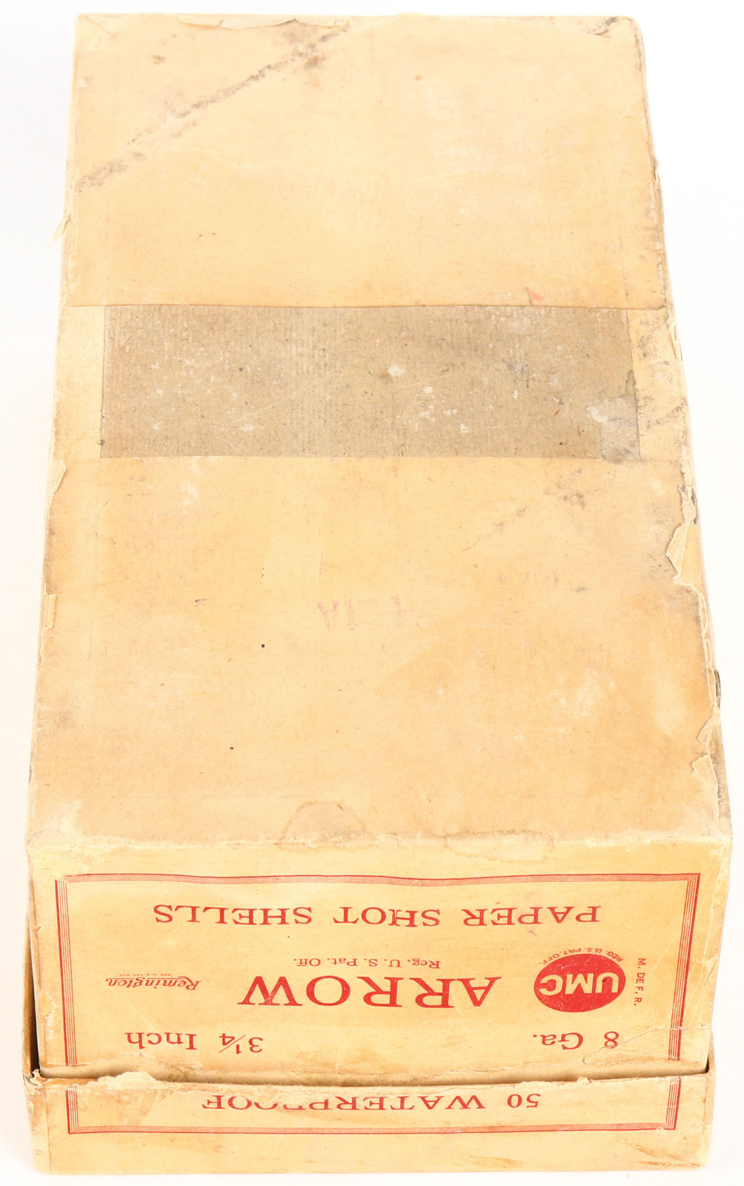 RARE SHOE BOX, Remington UMC, ARROW, 8ga., 2pc., Full, 3 1/4'', buff box with buff & red label, box is very solid with soiling & very nice label, Shells are excellent. Grade: Excellent - Value: 800 to 3000