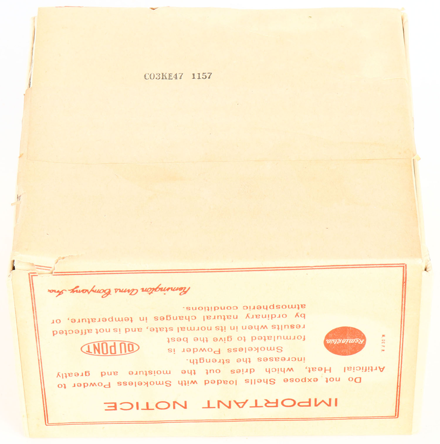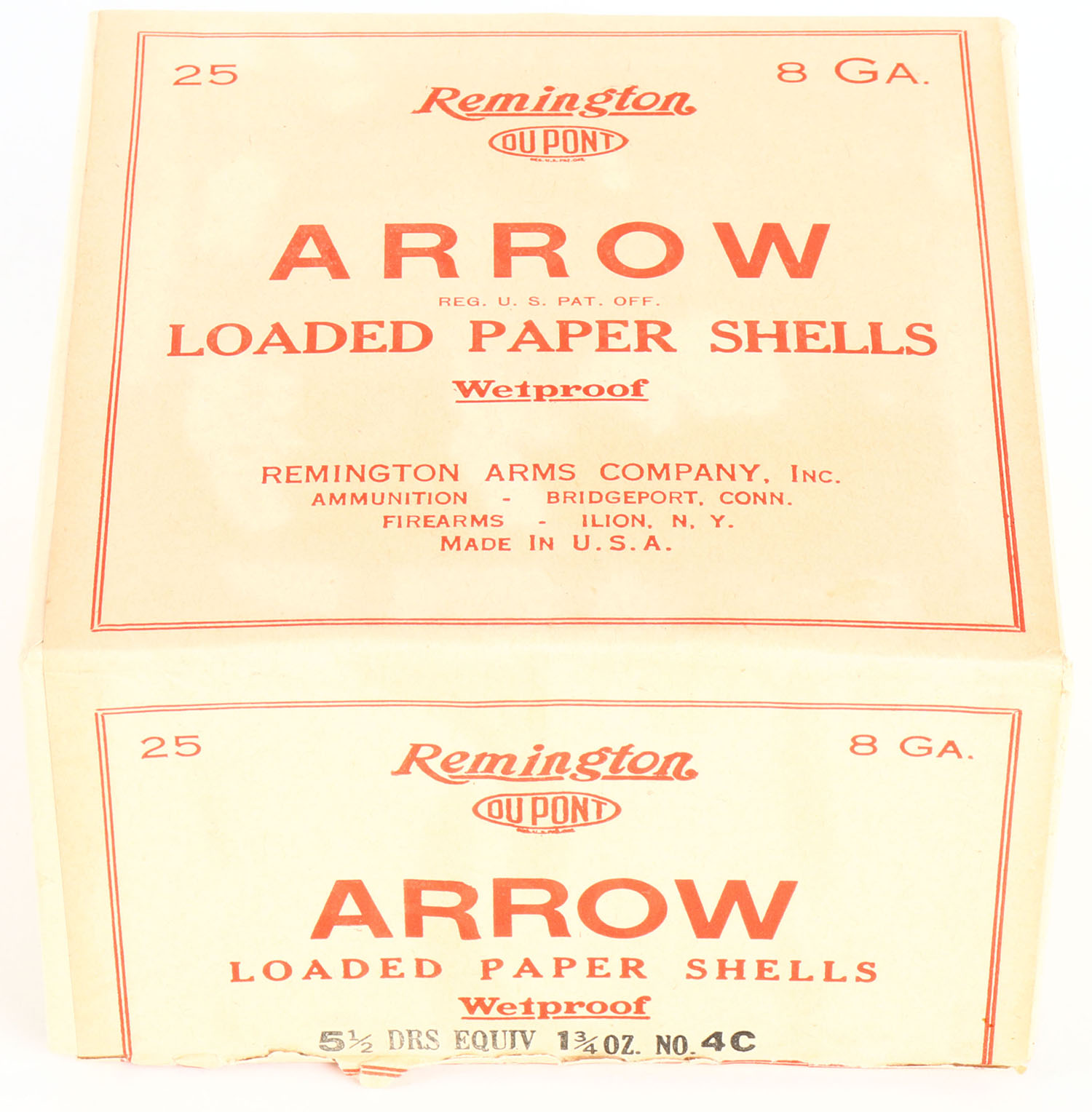 Remington UMC, ARROW, 8ga., 2pc., FULL & Half SEALED, Loading: 5 1/2 Drs. 1 3/4 Oz. No. 4C, buff box with buff & red label, box & label are very nice with seam split. Grade: Excellent + - Value: 100 to 600