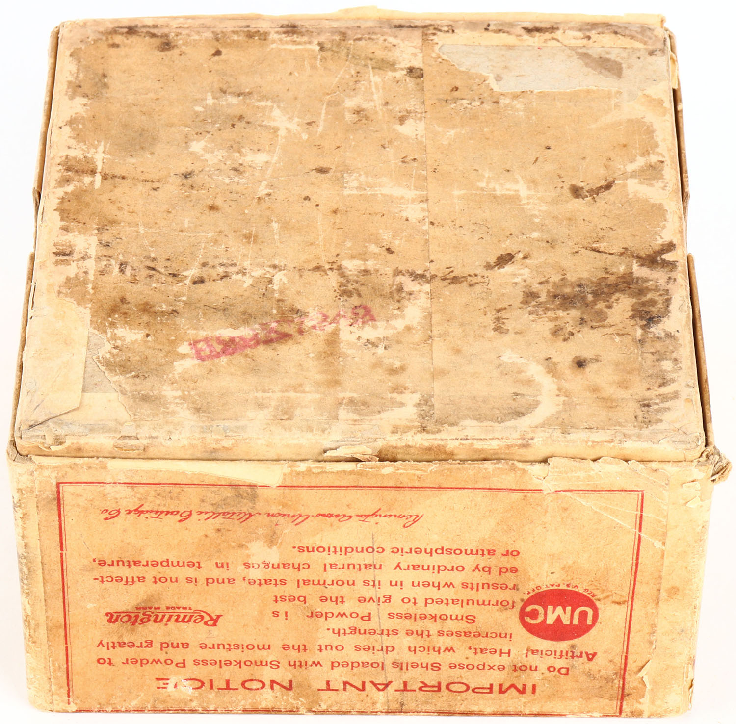 Remington UMC, ARROW, 8ga., 2pc., Full, Loading: 5 Drs. 1 1/2 Oz. No. 4, buff box with buff & red label, box & label are nice with age soiling, edge wear & light scuffing, Shells are very good. Grade: Very Good - Value: 100 to 600