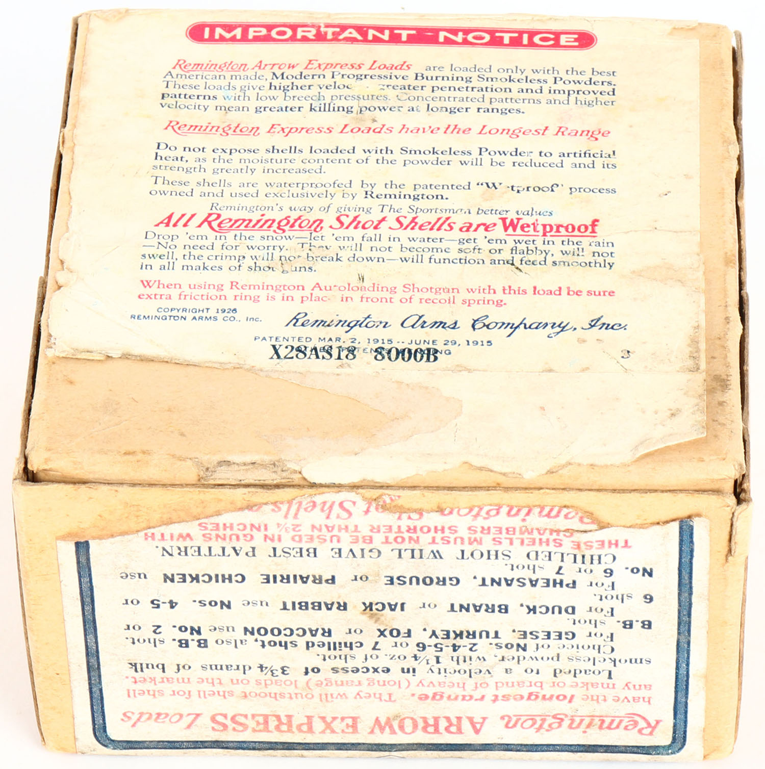 Remington UMC, Arrow Express, 12ga., 2 3/4'', 2pc., Empty, shot size 4CH, buff box with orange, blue & red label with shotshell on top & Sunburst logo, box has soiling & light scuffing to nice label. Grade: Very Good ++ - Value: 20 to 80