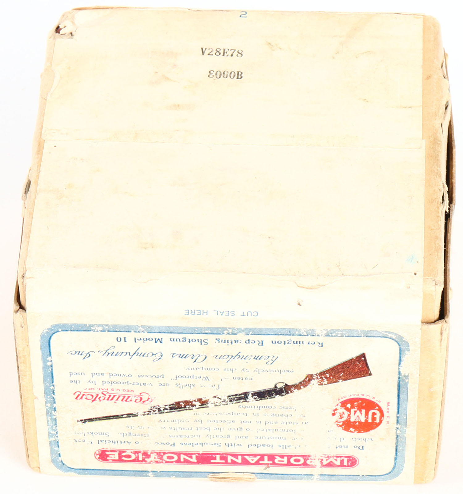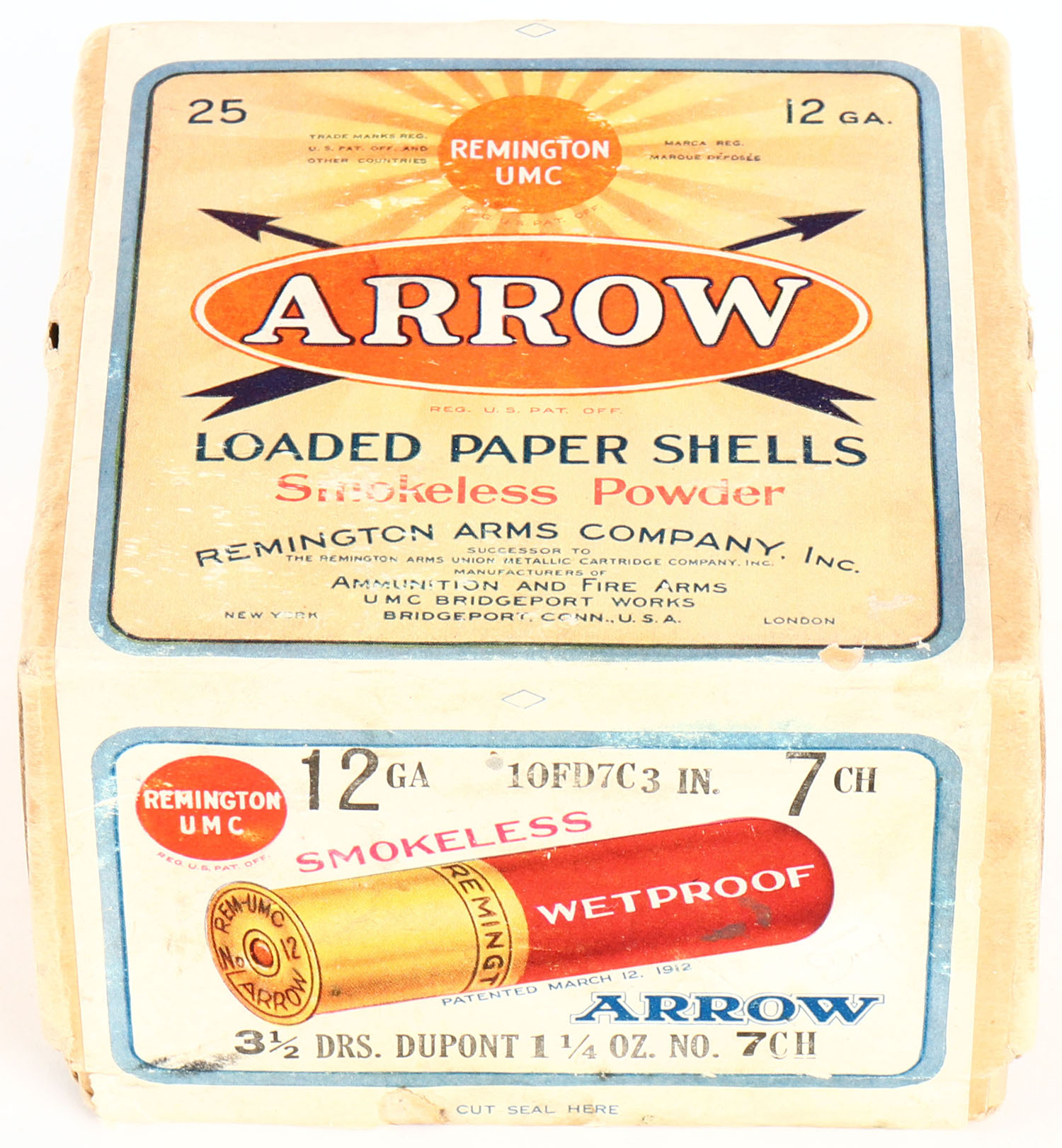 Remington UMC, Arrow, 12ga., 2pc., FULL & Half SEALED, shot size 7CH, buff box with orange, blue & red label with shotshell on side & Sunburst logo, box has light scuffing, shell protrusions & light edge wear to nice label. Grade: Very Good ++ - Value: 60 to 200