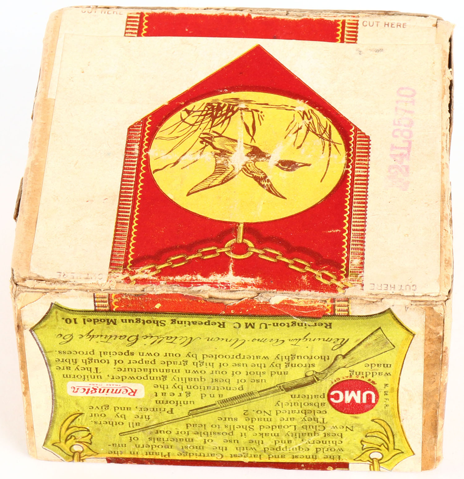 Remington UMC, New Club, 12ga, 2pc., Empty, shot size 6, buff box with green, blue & red paper label, box has tape repair, seam splits & light soiling with very nice color to label. Grade: Very Good ++ - Value: 20 to 80