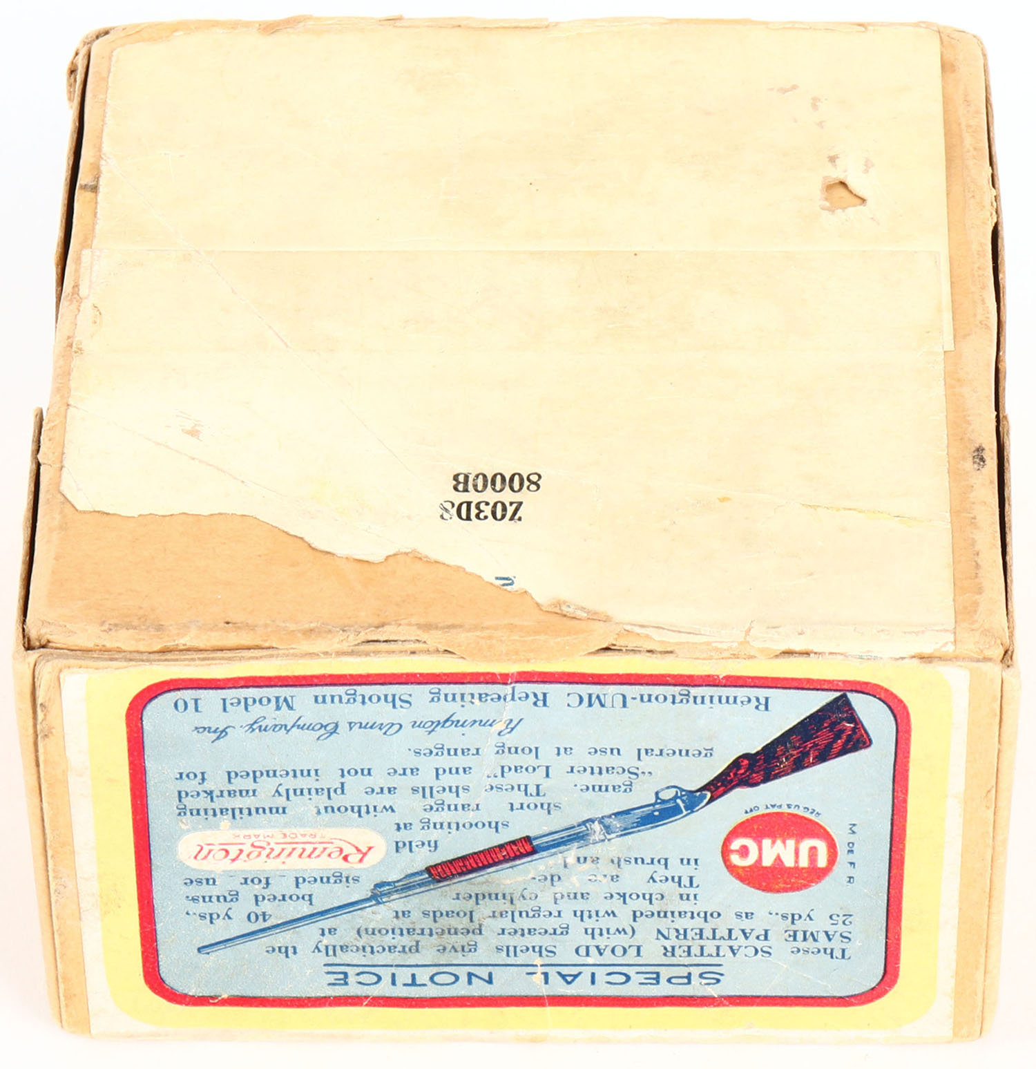Remington U.M.C., Nitro Club Scatter Load, 12ga., 2 3/4'', 2pc., Empty, shot size 6CH, buff box with blue, yellow, and red colors, box is very solid with light soiling, seam split, light edge wear & very nice colors to label. Grade: Very Good ++ - Value: 60 to 300