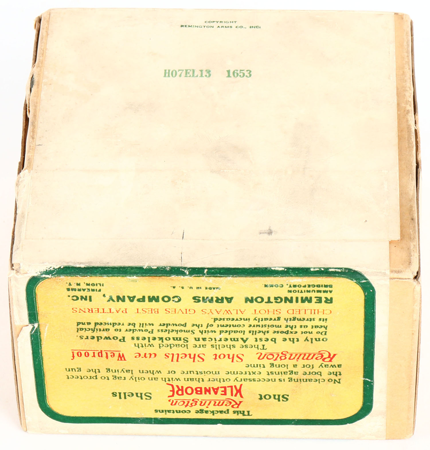Remington UMC, Nitro Club, 12ga., 2pc., FULL and SEALED, Loading: 3 1/4 Drs. 1 1/8 Oz. No. 8, buff box with sunburst logo & Mallard flying on top, box has very nice colors with light soiling & small shell protrusions. Grade: Excellent - Value: 100 to 400