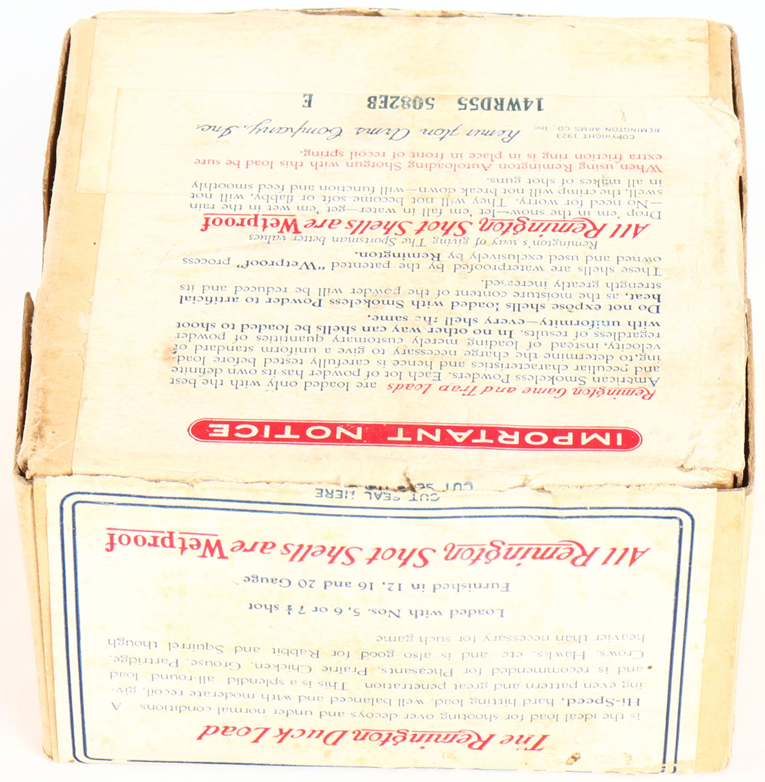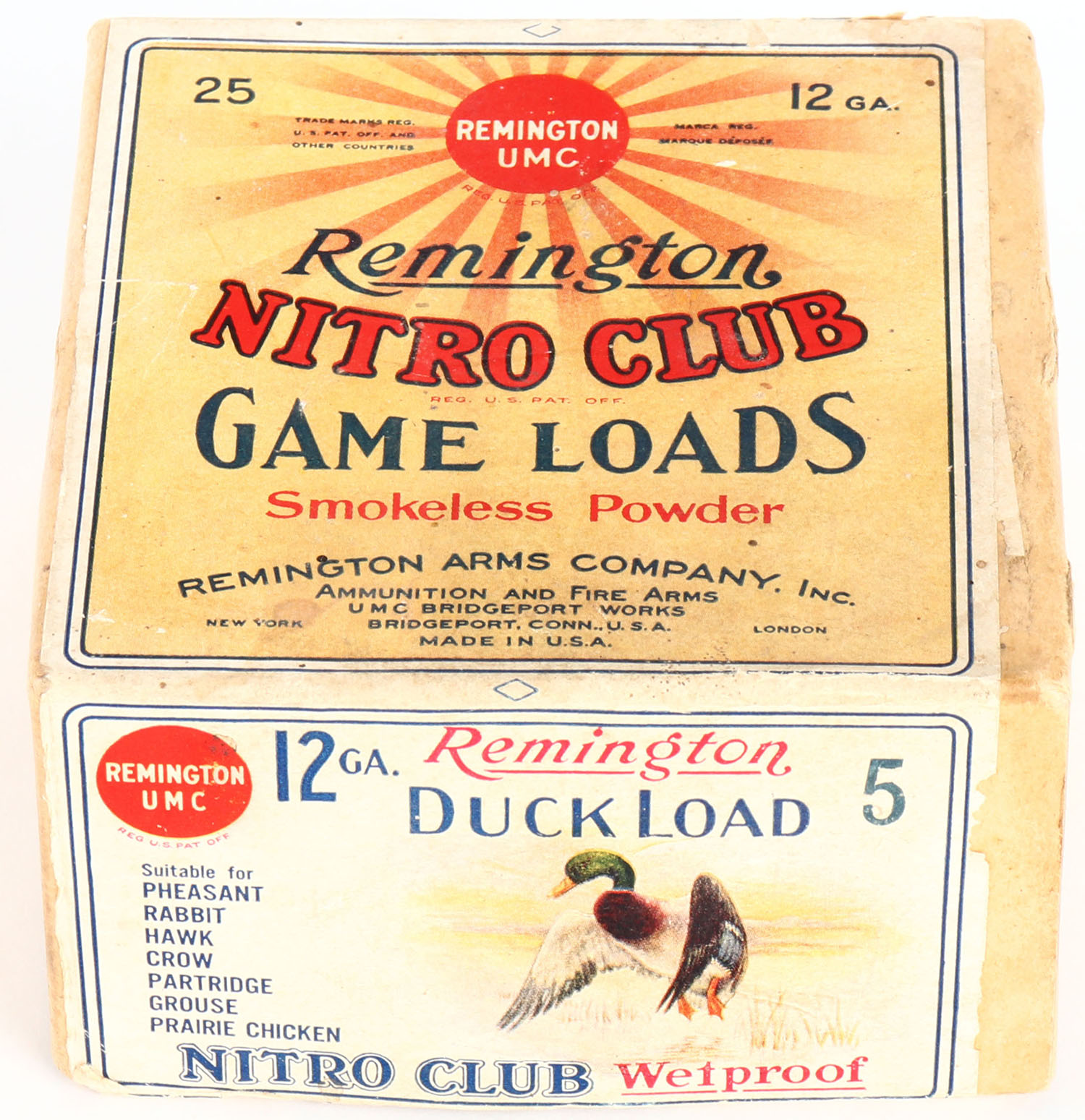Remington UMC Nitro Club, GAME LOADS, DUCK LOAD, 12ga., 2pc., Empty, shot size 5, buff box with sunburst logo & Mallard Landing on side, box is solid, labels are original, box has seam splits & light soiling. Grade: Very Good ++ - Value: 80 to 250