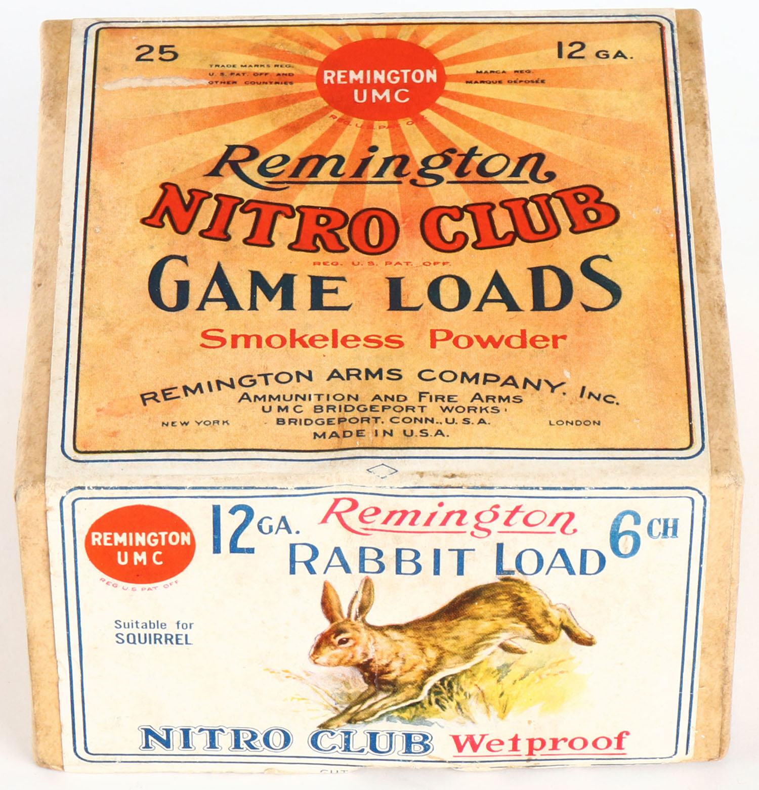 Remington UMC Nitro Club, GAME LOADS, 12ga, 2pc., Empty, shot size 6 CH, buff box with sunburst logo and a rabbit on side, box is solid with very good colors & even coat of soiling. Grade: Very Good ++ - Value: 80 to 300