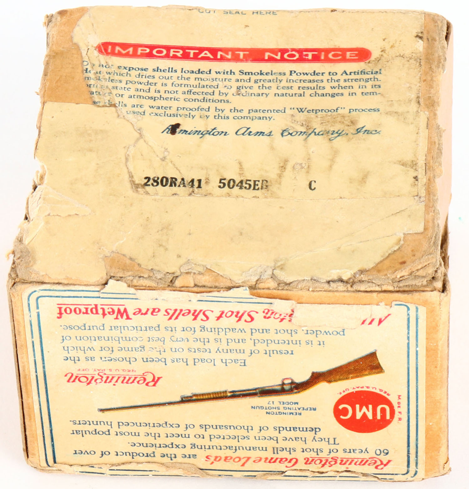 Remington UMC Nitro Club, GAME LOADS, QUAIL LOAD, 20ga., 2pc., Empty, shot size 8 CH, buff box with sunburst logo & two QUAIL in flight on side, box has seam splits, edge wear & tape repair with nice label. Grade: Very Good + - Value: 60 to 250