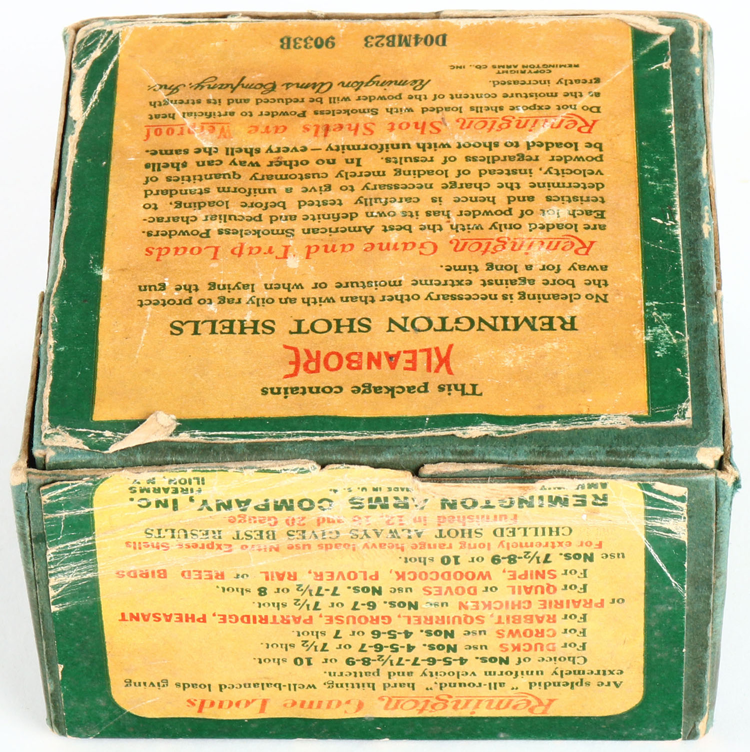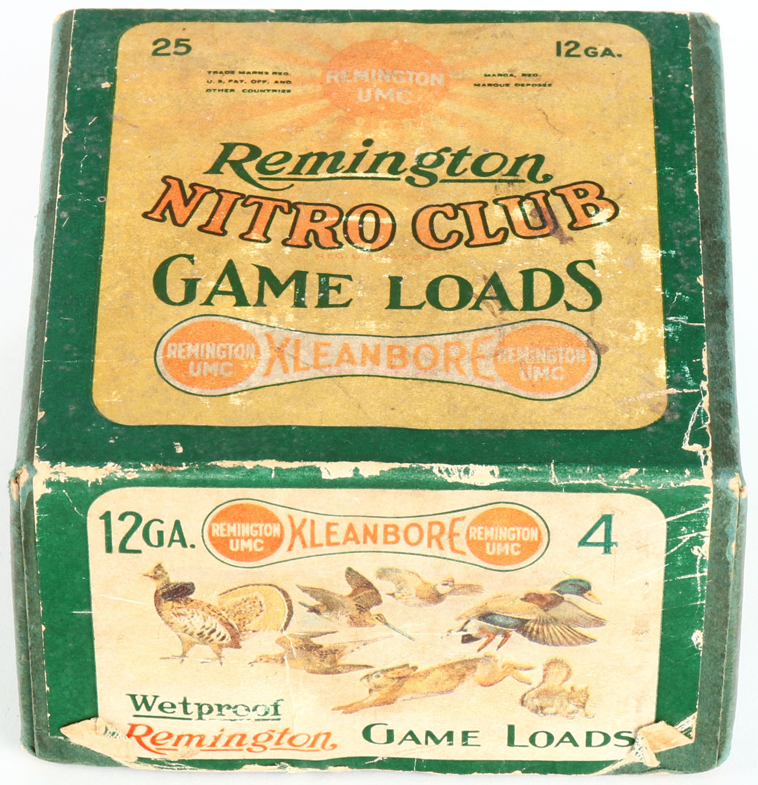 Remington UMC Nitro Club, GAME LOADS, 12ga, 2pc., Empty, shot size 4, buff box with sunburst logo & a variety of animals on the side, box has age soiling & light edge wear with okay color to label. Grade: Very Good - Value: 40 to 150