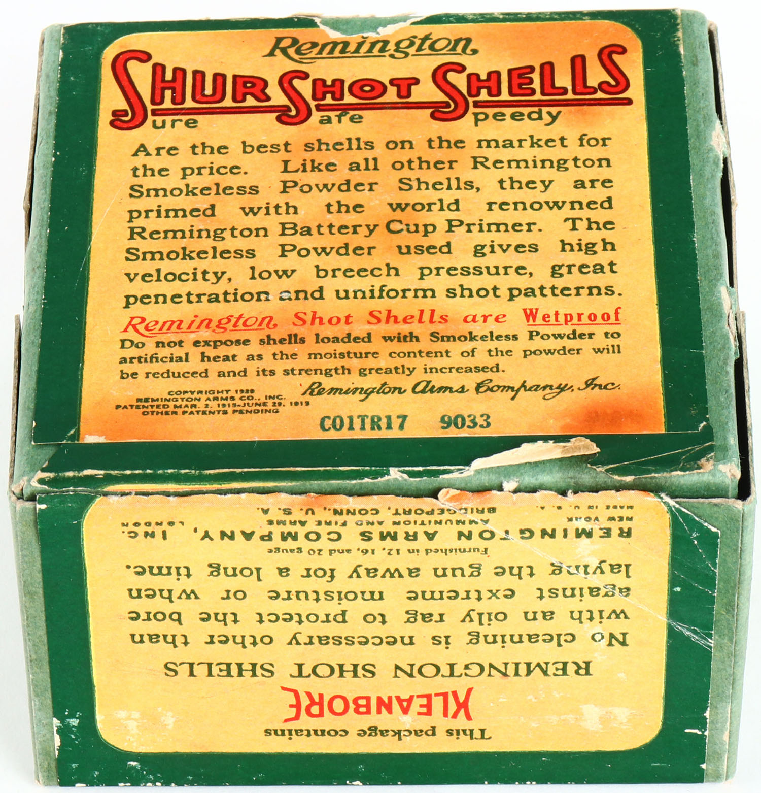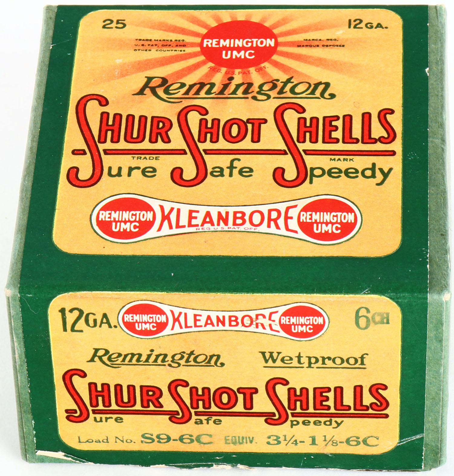 Remington UMC, Shur Shot Shells, 12ga., 2pc., Partial 17rds, shot size 6 CH, green box with green, yellow & red paper label, box is very solid with great colors & light soiling to bottom, Shells are excellent. Grade: Excellent - Value: 40 to 100