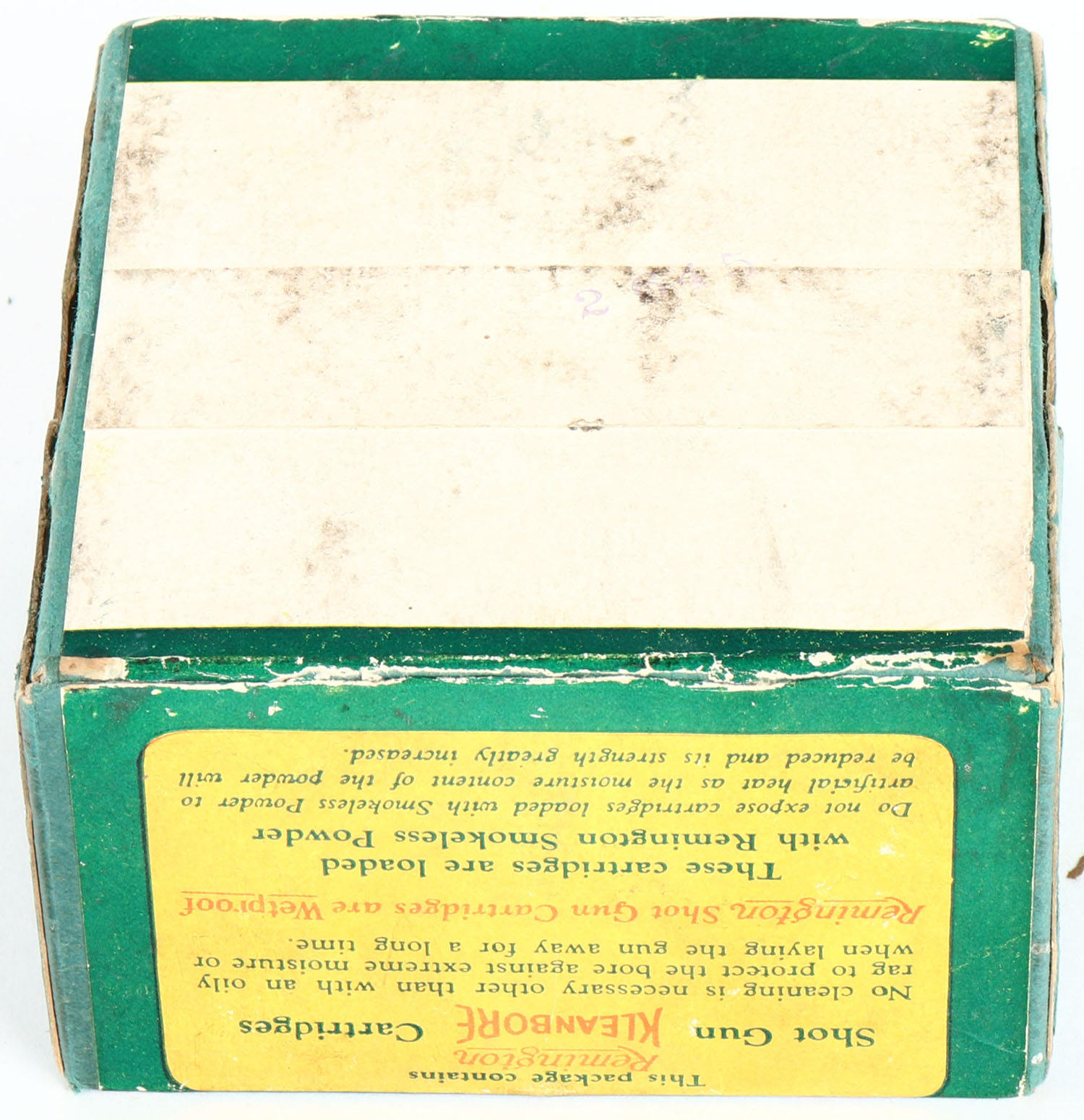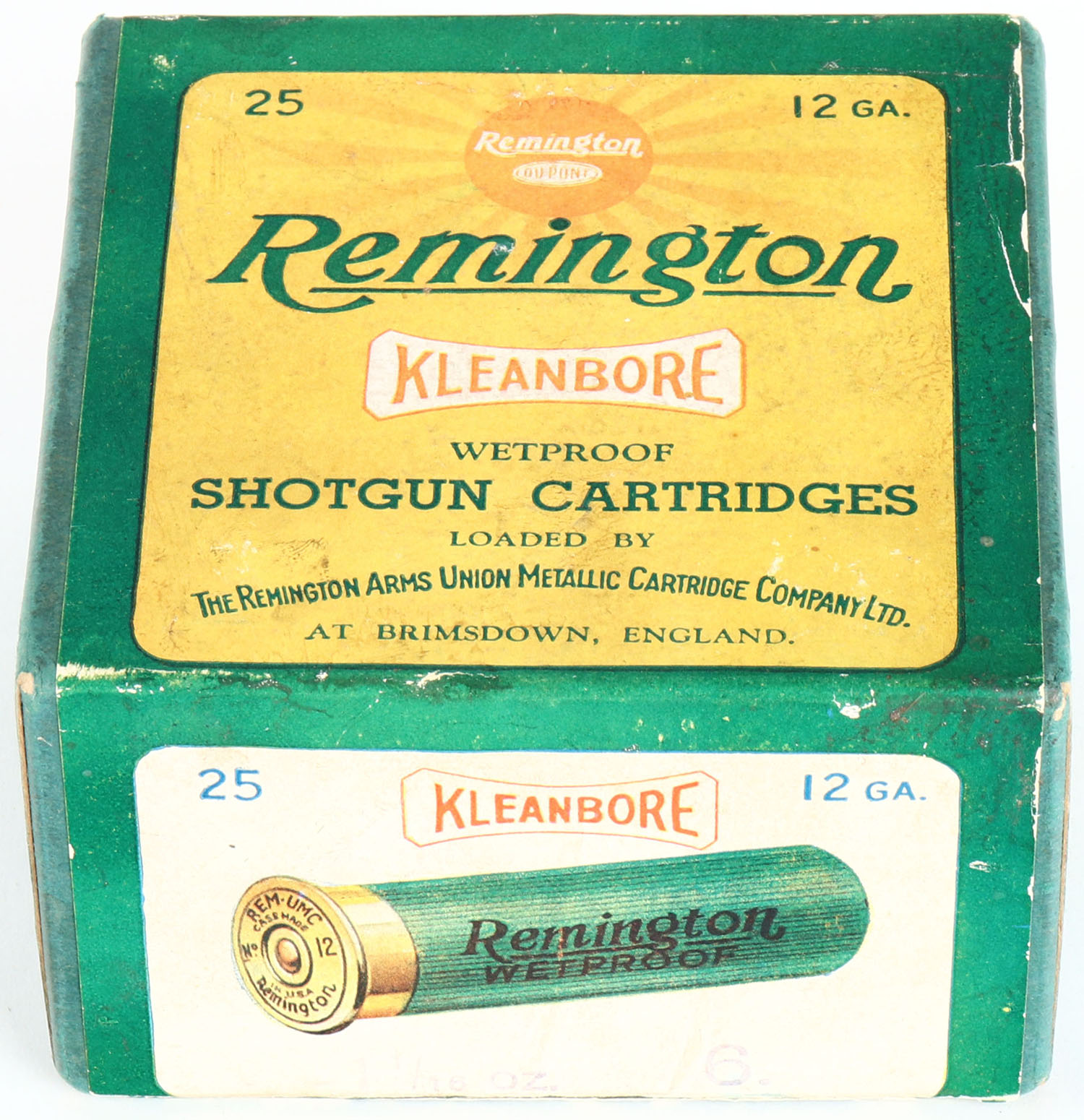 Remington, Kleanbore, LOADED IN ENGLAND, 12ga., 2pc., Empty, shot size 6, green box with green, yellow & red paper label, box is very solid with age soiling. Grade: Very Good ++ - Value: 40 to 200