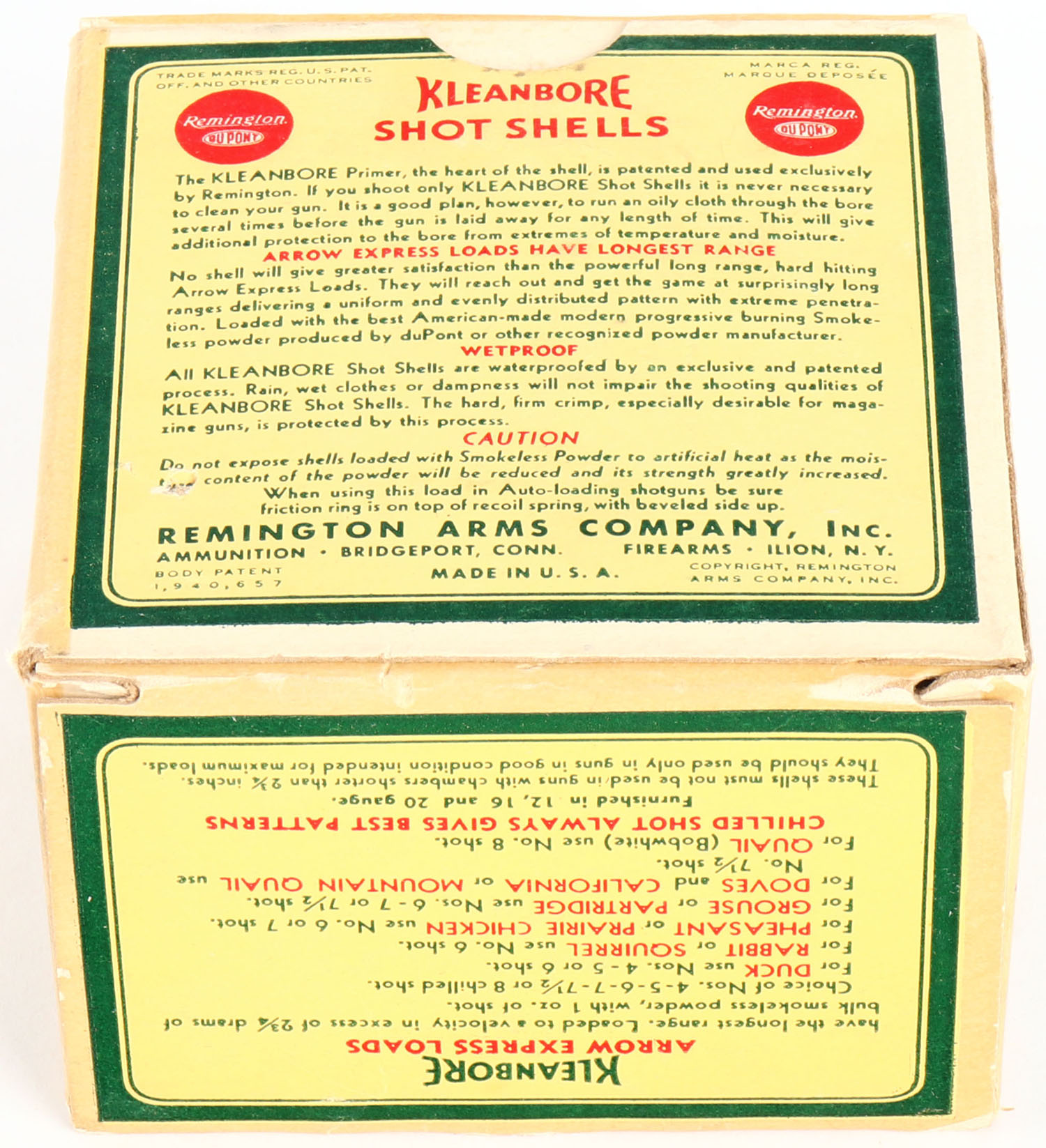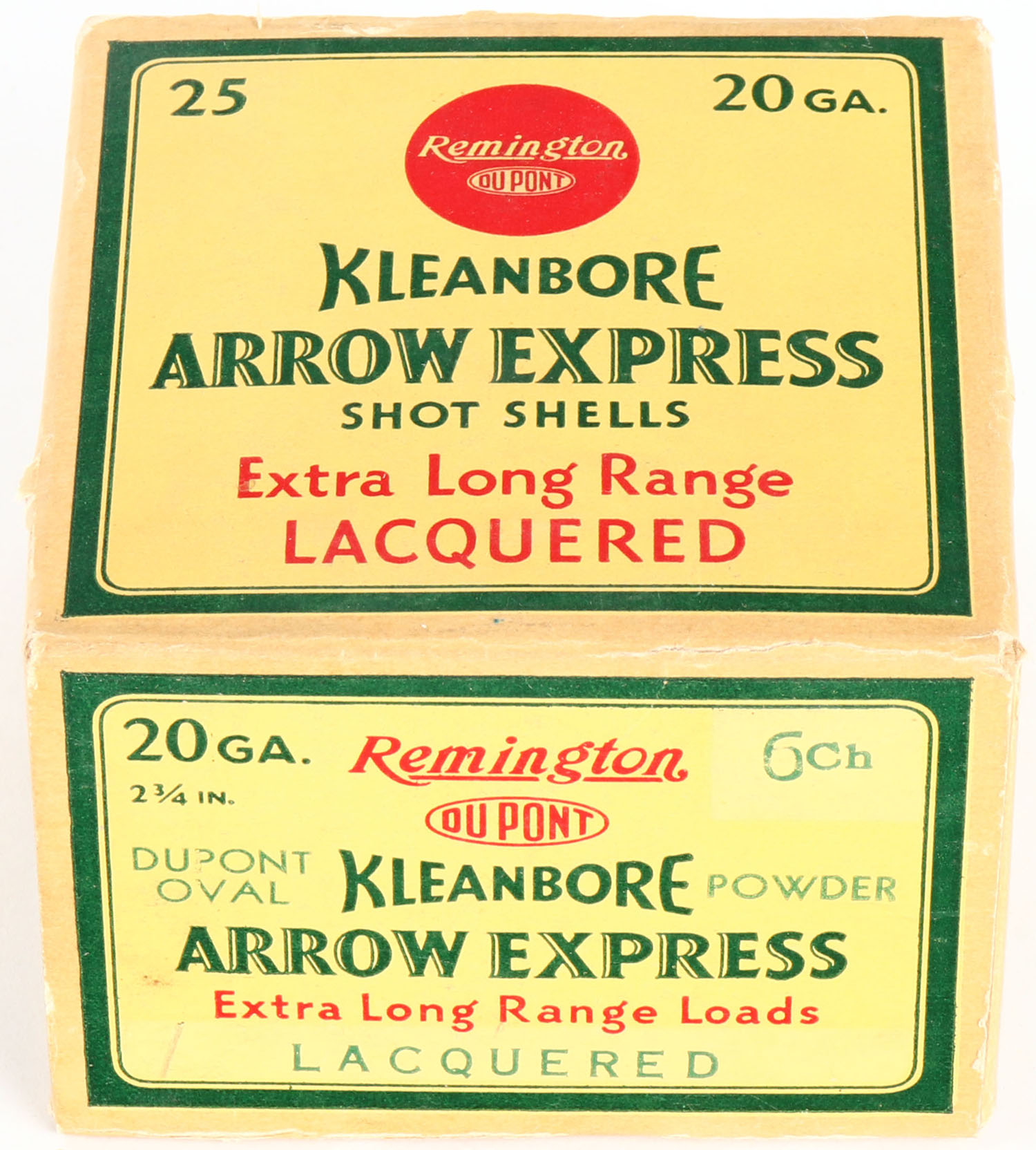 Remington, Kleanbore, ARROW EXPRESS, Extra Long Range Lacquered 20ga., 2 3/4'', 1pc., Full, shot size 6 Ch, box is buff, yellow, red and green, box has light edge wear with very nice colors, shells are excellent. Grade: Excellent - Value: 20 to 60