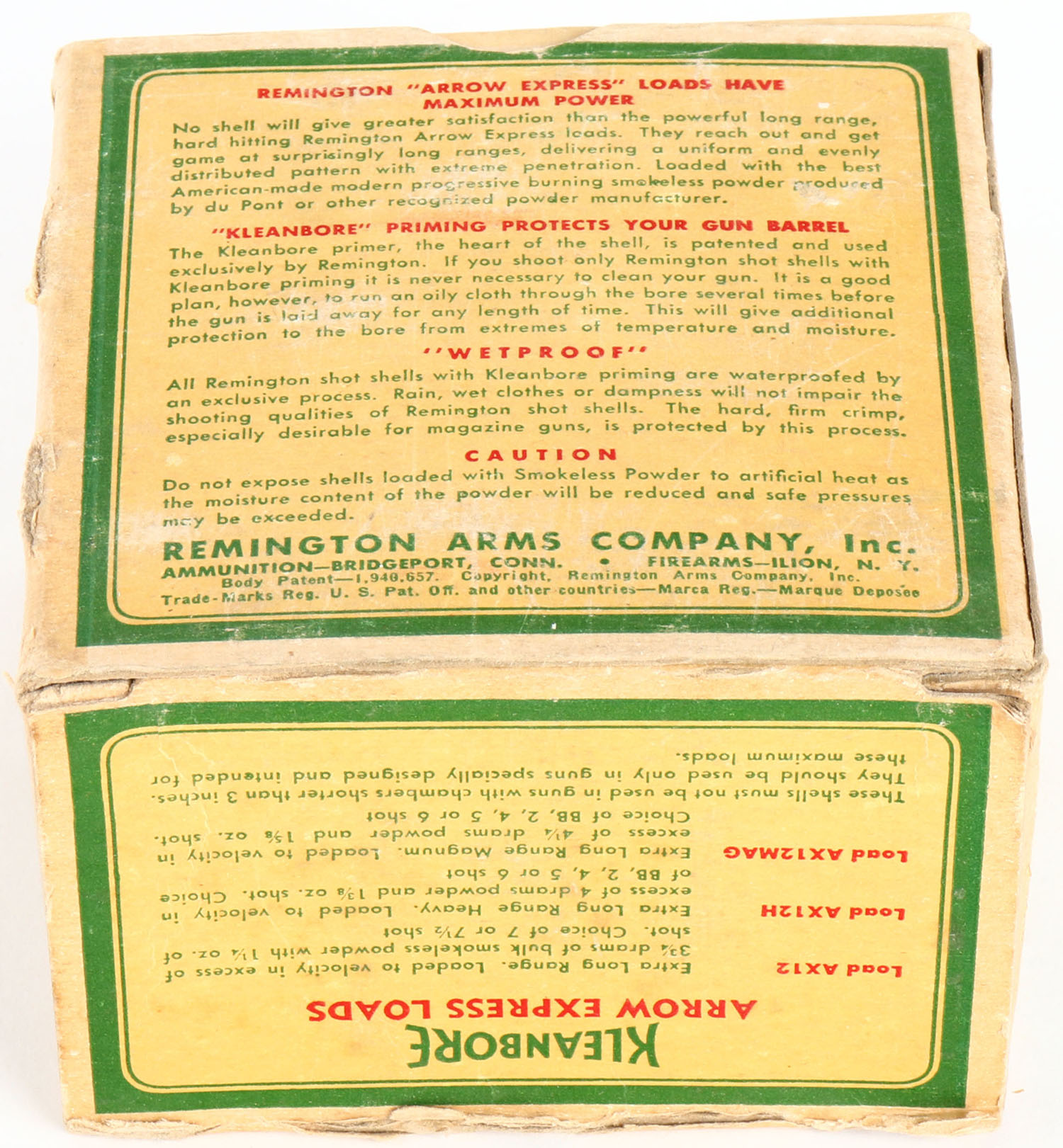 Remington, Kleanbore, ARROW EXPRESS, 12ga., 3'', 1pc., Full, shot size 5 Magnum, box is buff, yellow, red and green, box has shell protrusions & edge wear with nice colors, shells are excellent. Grade: Very Good ++ - Value: 20 to 60