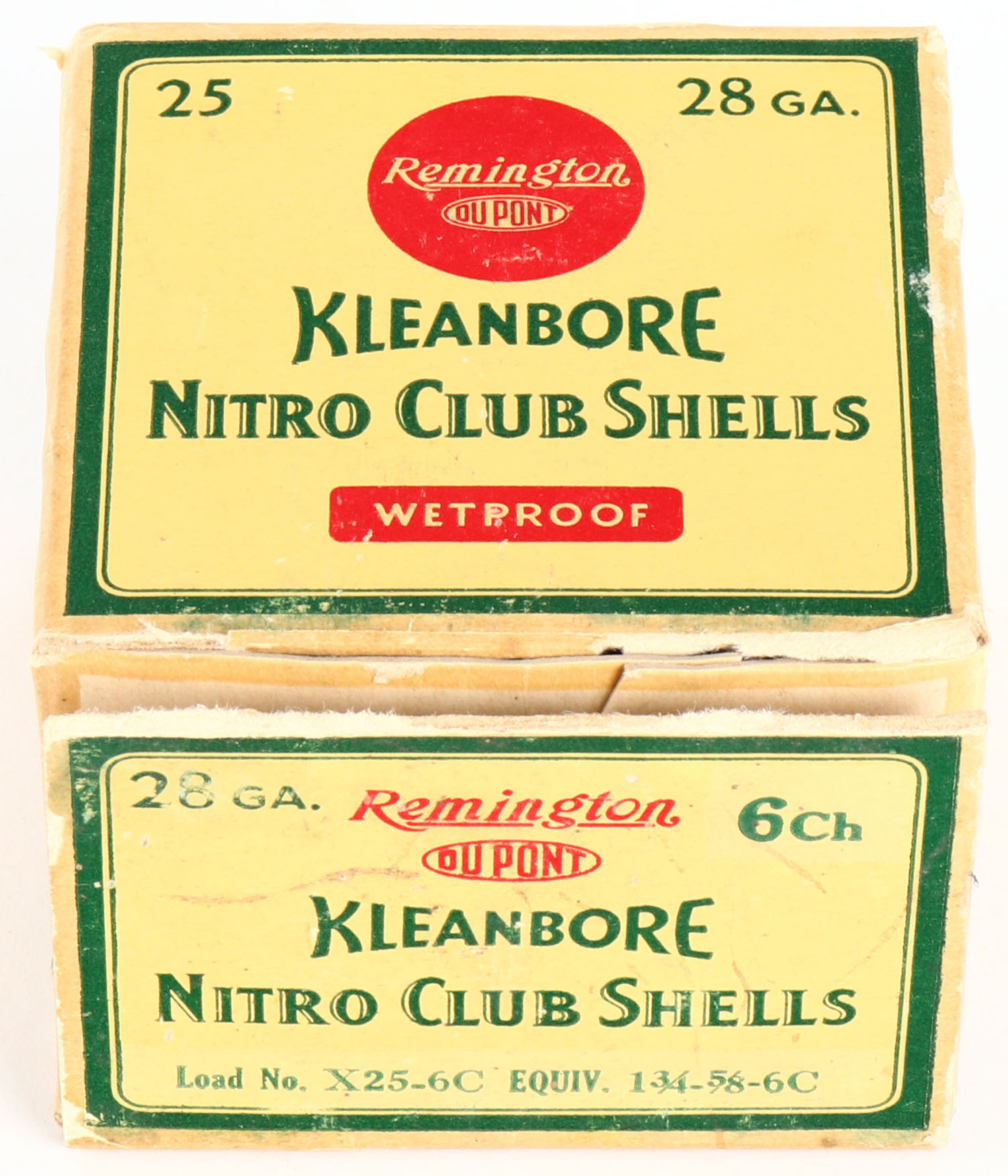 Remington, Kleanbore, NITRO CLUB SHELLS, 28ga., 1pc., Full, shot size 6C, box is buff, yellow, red and green, box has disconnected top flap, light soiling to top flap & light edge wear, with very nice colors, shells are excellent. Grade: Very Good ++ - Value: 20 to 60