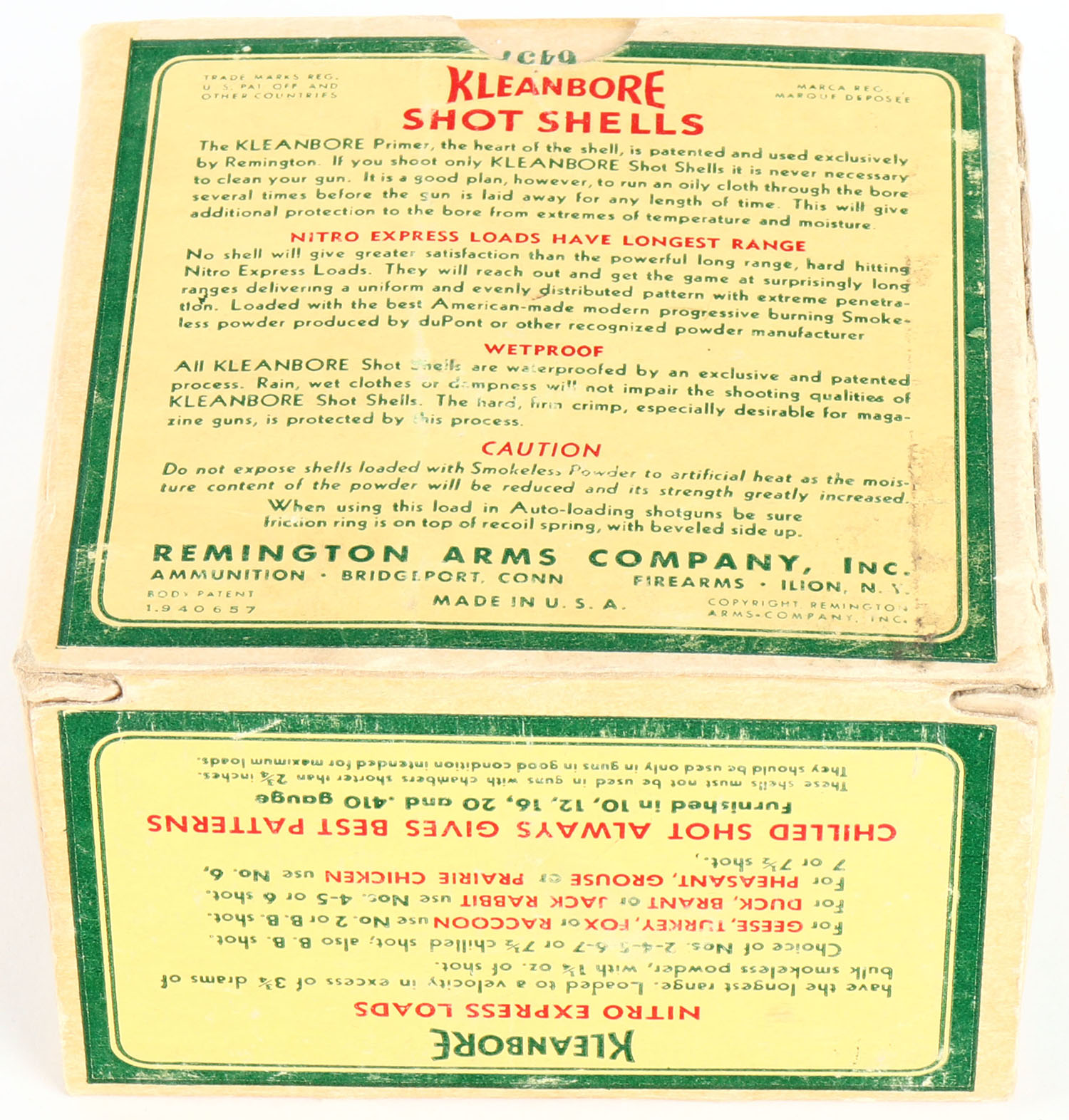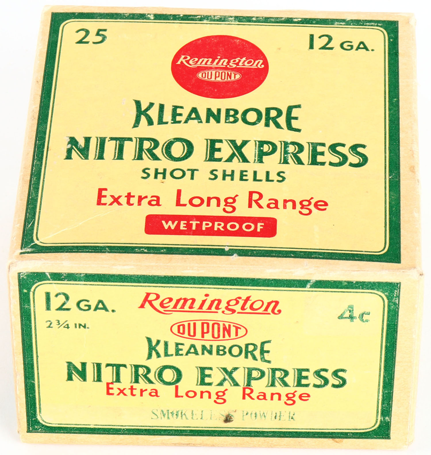 Remington, Kleanbore, NITRO EXPRESS, 12ga., 2 3/4'', 1pc., Partial 21rds with 3rds being correct shot size, shot size 4C, box is buff, yellow, red and green, box has light scuffing & light edge wear with very nice colors, shells are very good. Grade: Very Good ++ - Value: 20 to 50