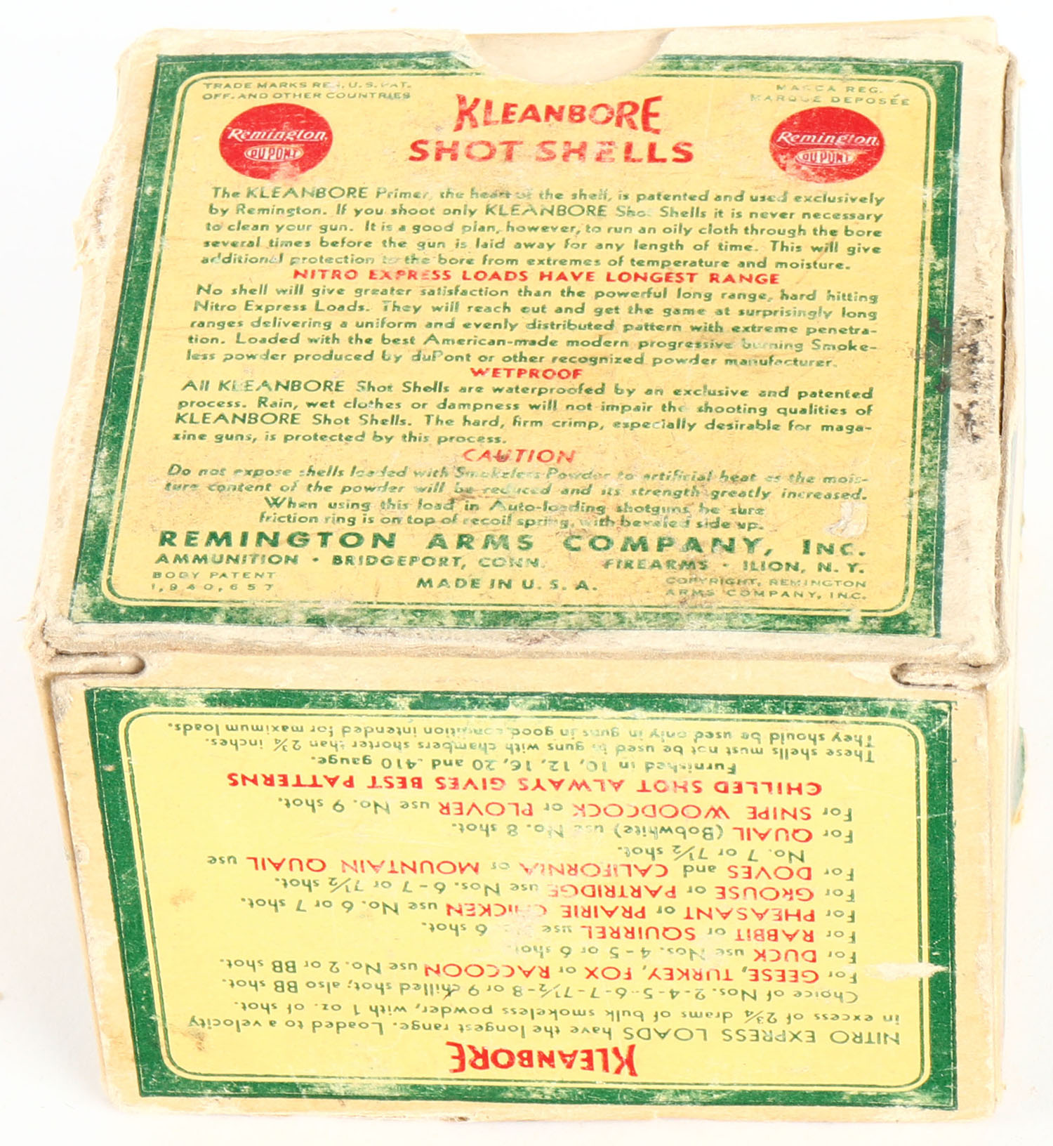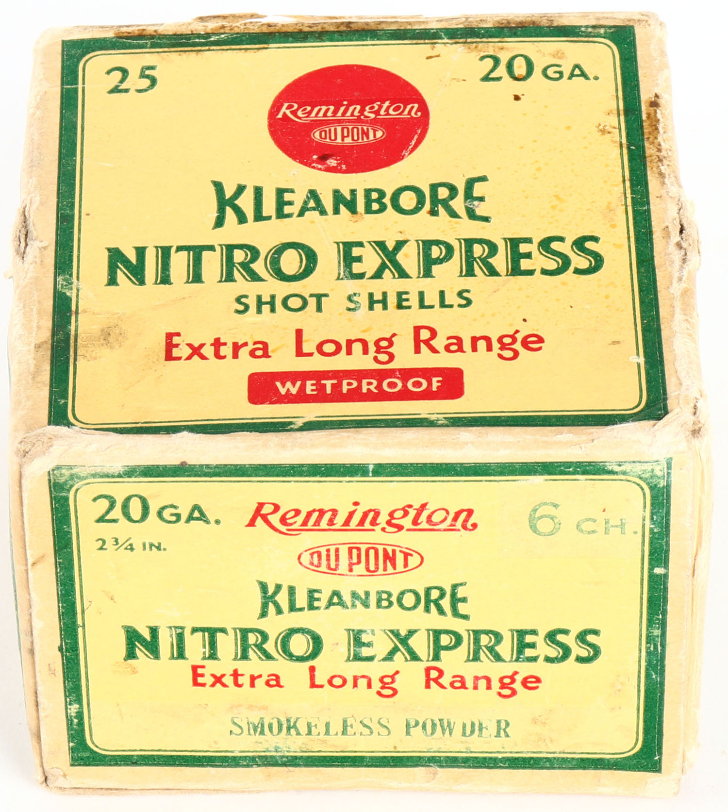 Remington, Kleanbore, NITRO EXPRESS, 20ga., 2 3/4'', 1pc., Full, shot size 6 CH, box is buff, yellow, red and green, box has edge wear, light soiling & scuffing with okay colors, shells are excellent. Grade: Very Good + - Value: 20 to 60