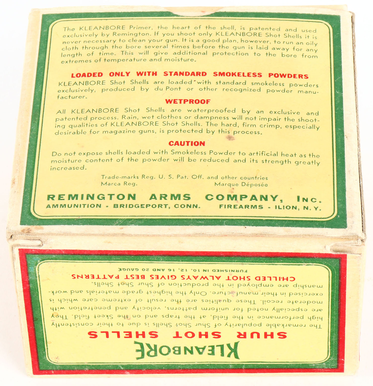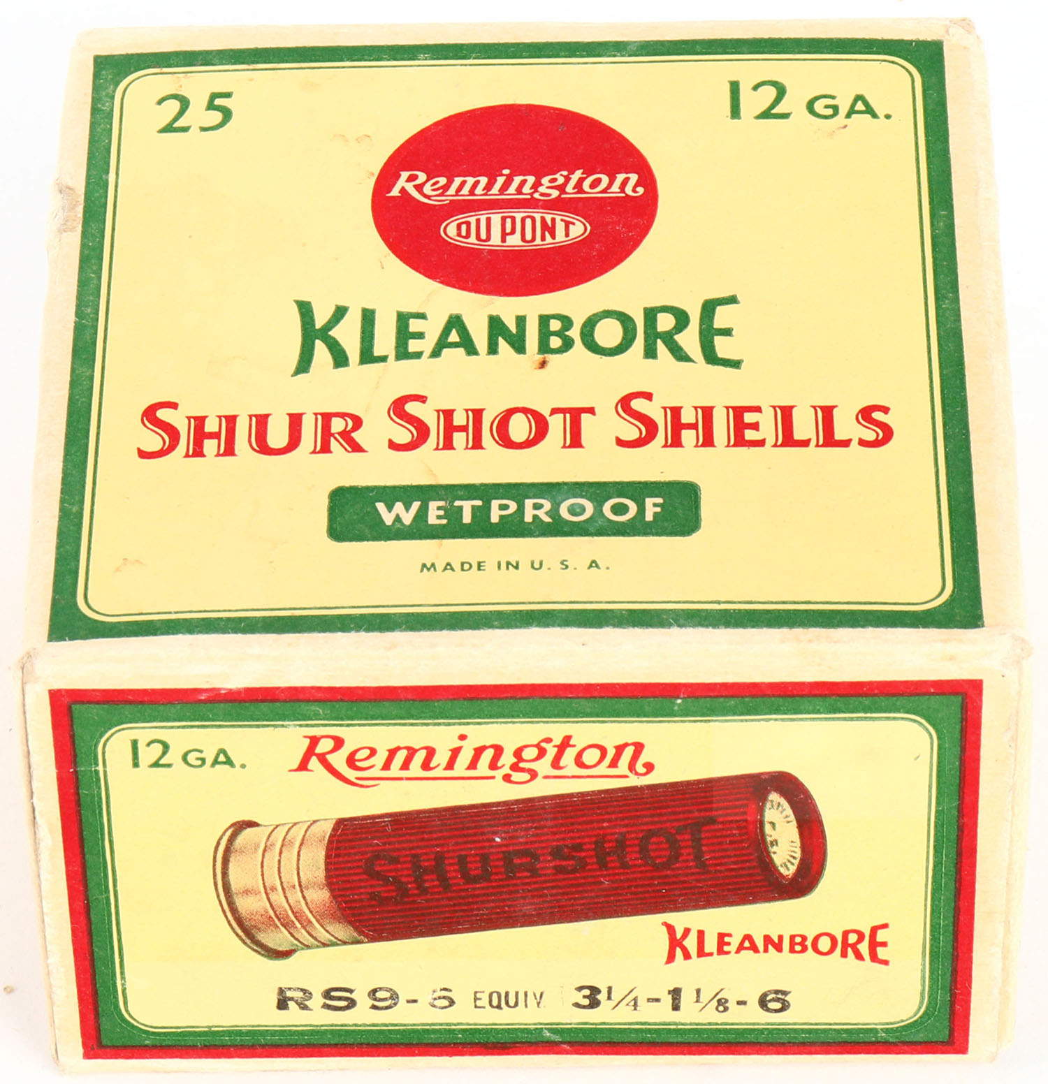 Remington, Kleanbore, SHUR SHOT SHELLS, 12ga., 1pc., Partial 24rds with 1rd being incorrect shot size, shot size 6, box is buff, yellow, red and green, box has light soiling with very nice colors, shells are excellent. Grade: Excellent - Value: 20 to 60