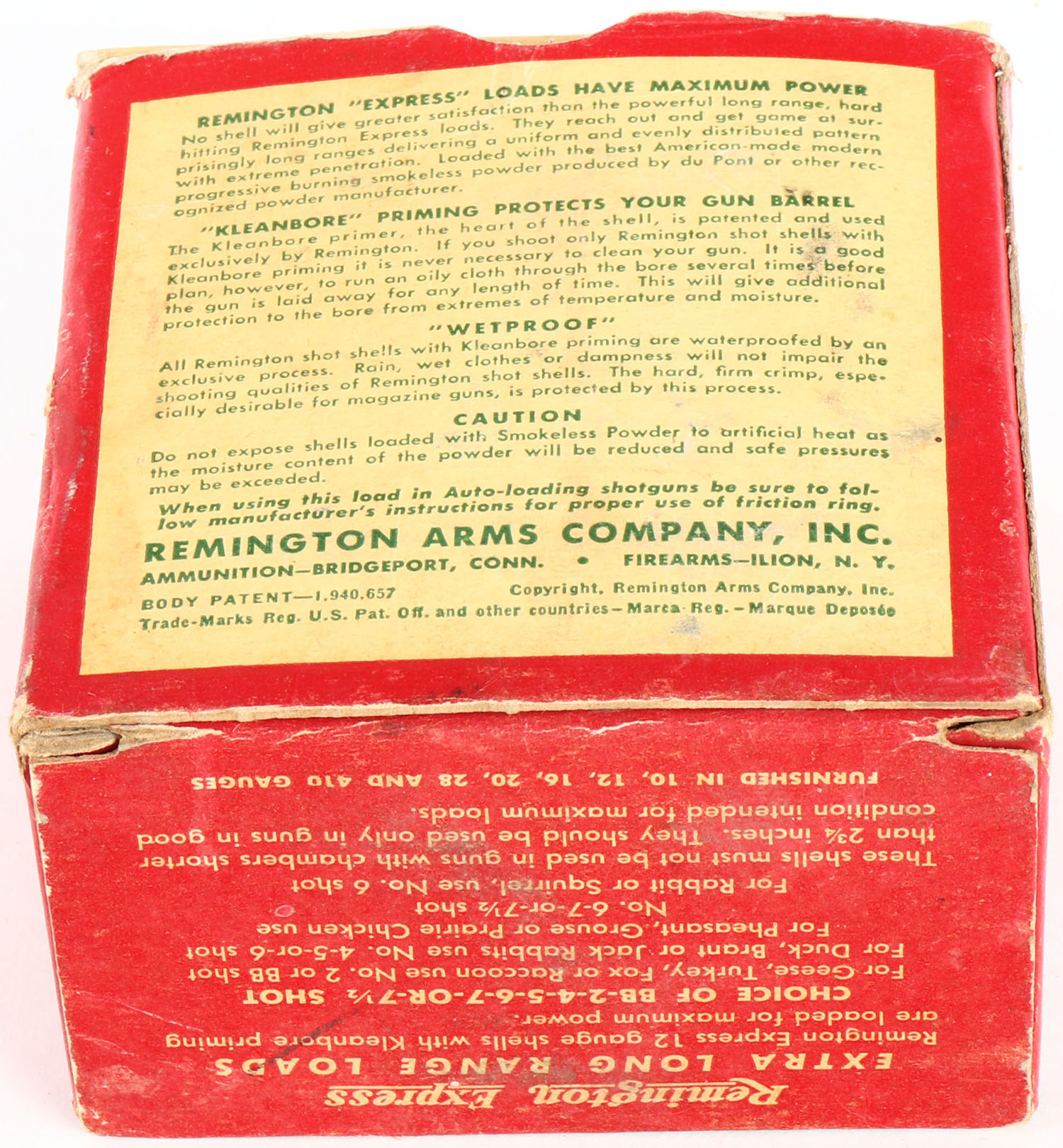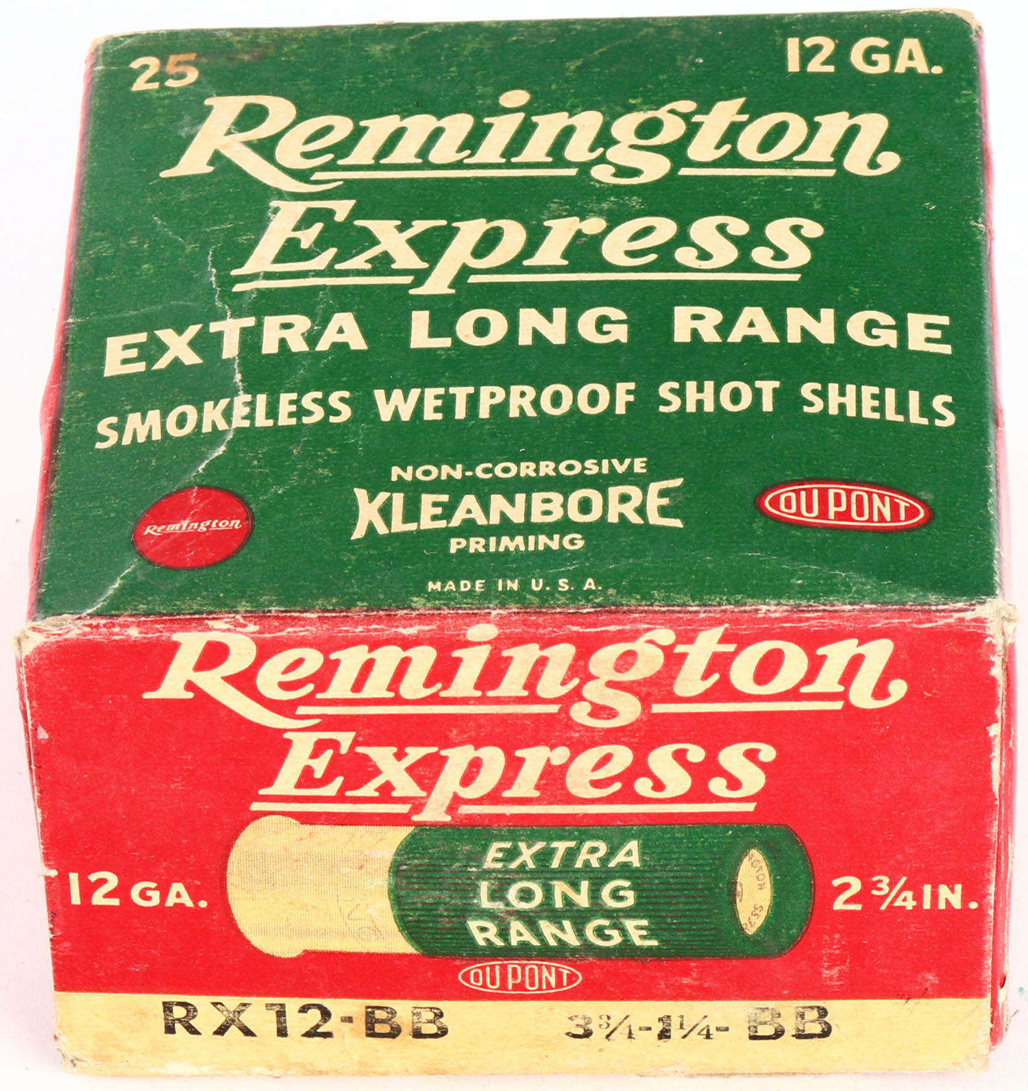 Remington Express, Extra Long Range, 12ga., 1pc., Partial 21rds with 8rds being incorrect shot size/length, shot size BB, box is white, yellow, red and green, box has light soiling & light edge wear with nice colors, shells are excellent. Grade: Very Good ++ - Value: 10 to 40