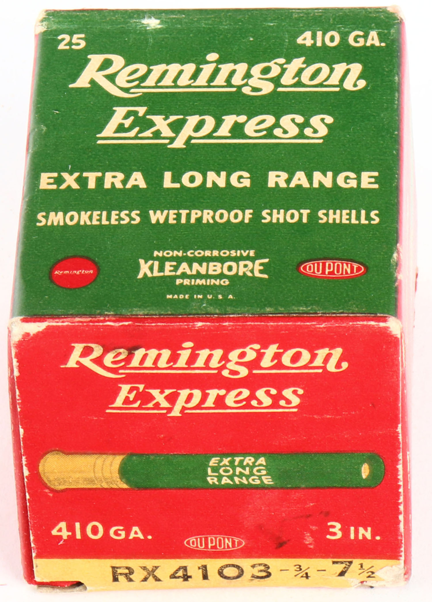 Remington Express, Extra Long Range, 410ga., 3'', 1pc., Full, shot size 7 1/2, box is white, yellow, red and green, box is very solid with very nice colors, shells are excellent. Grade: Excellent - Value: 10 to 50