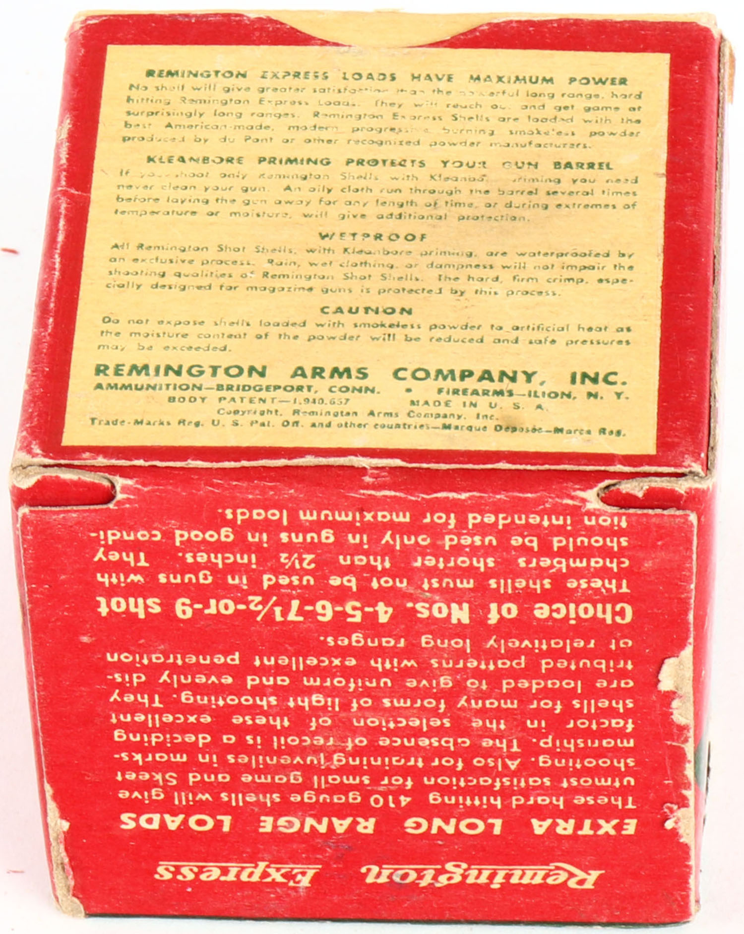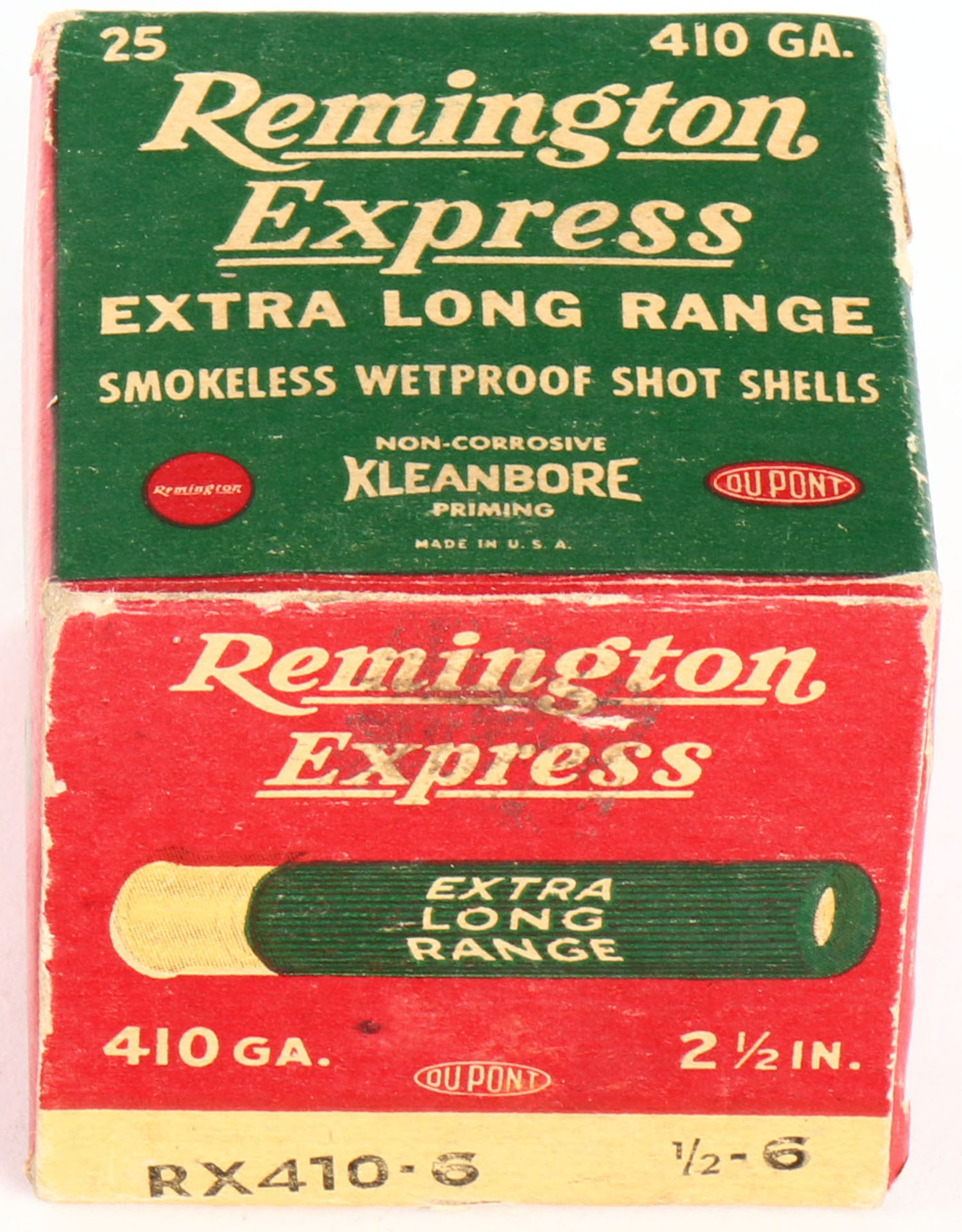Remington Express, Extra Long Range, 410ga., 2 1/2'', 1pc., Full, shot size 6, box is white, yellow, red and green, box has edge wear, is solid with very nice colors, shells are excellent. Grade: Very Good ++ - Value: 10 to 50