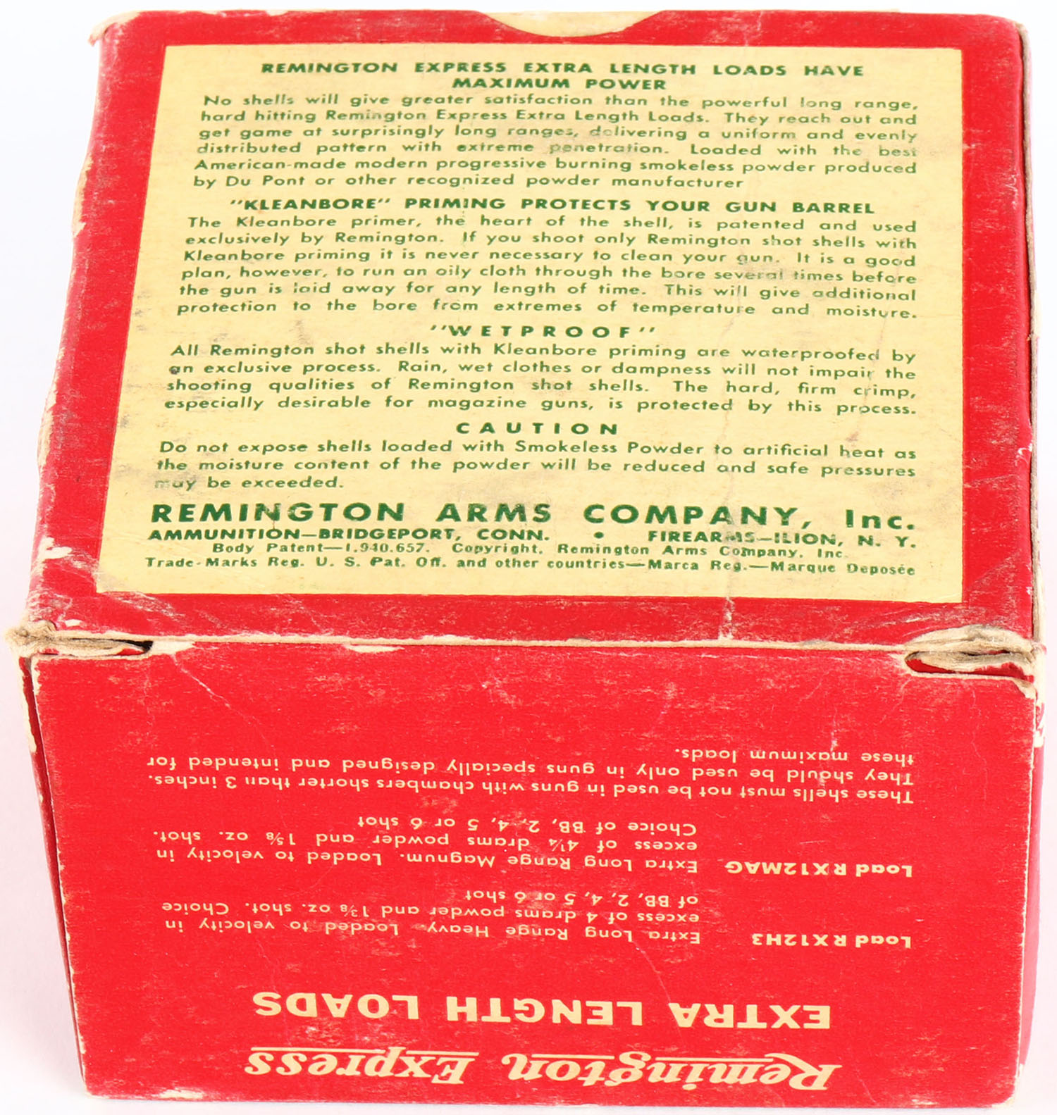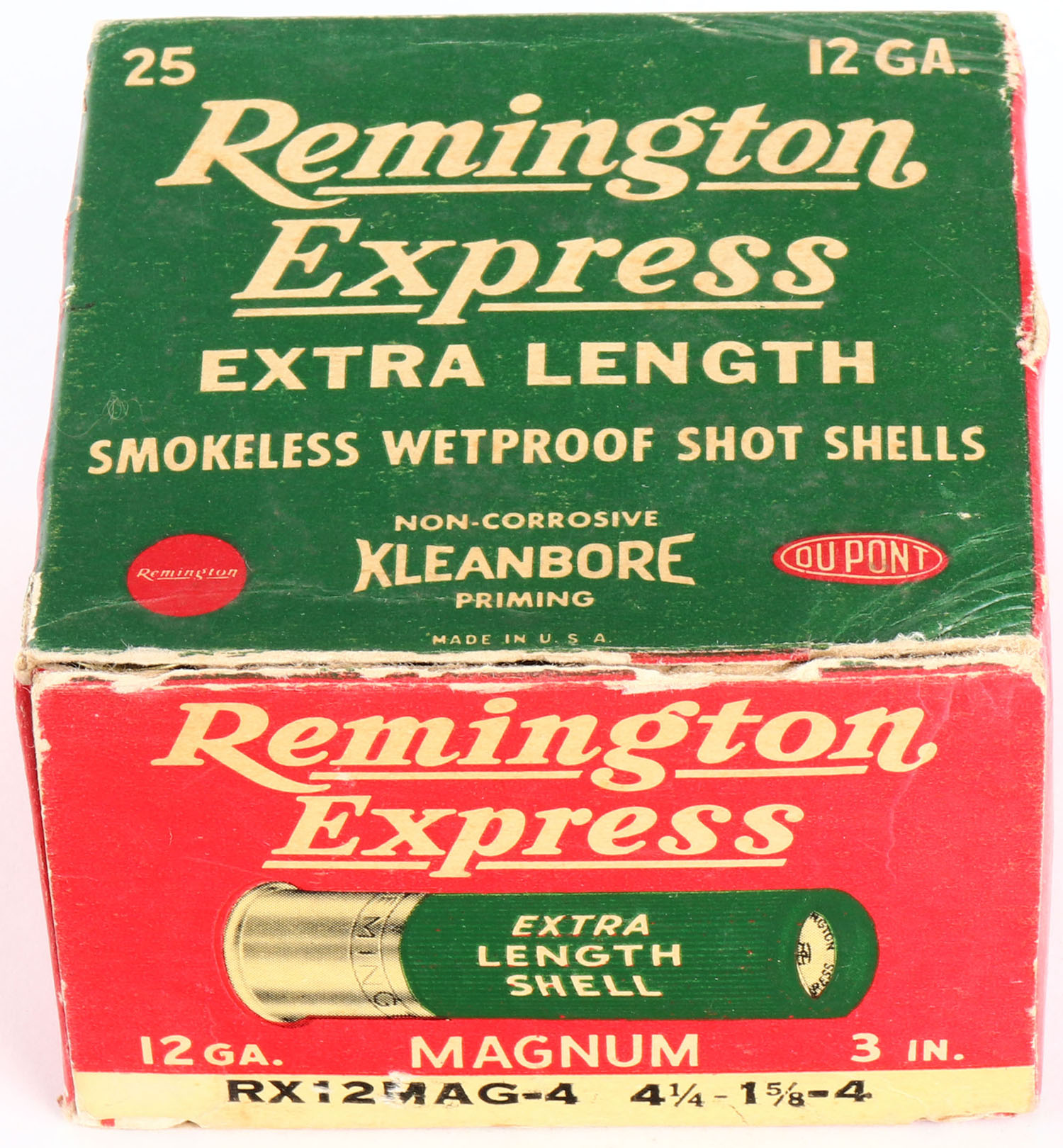Remington Express, Extra Length, 12ga., 3'', 1pc., Full, shot size 4 Magnum, box is white, yellow, red and green, box has edge wear, top flap is torn with very nice colors, shells are excellent. Grade: Very Good ++ - Value: 10 to 50