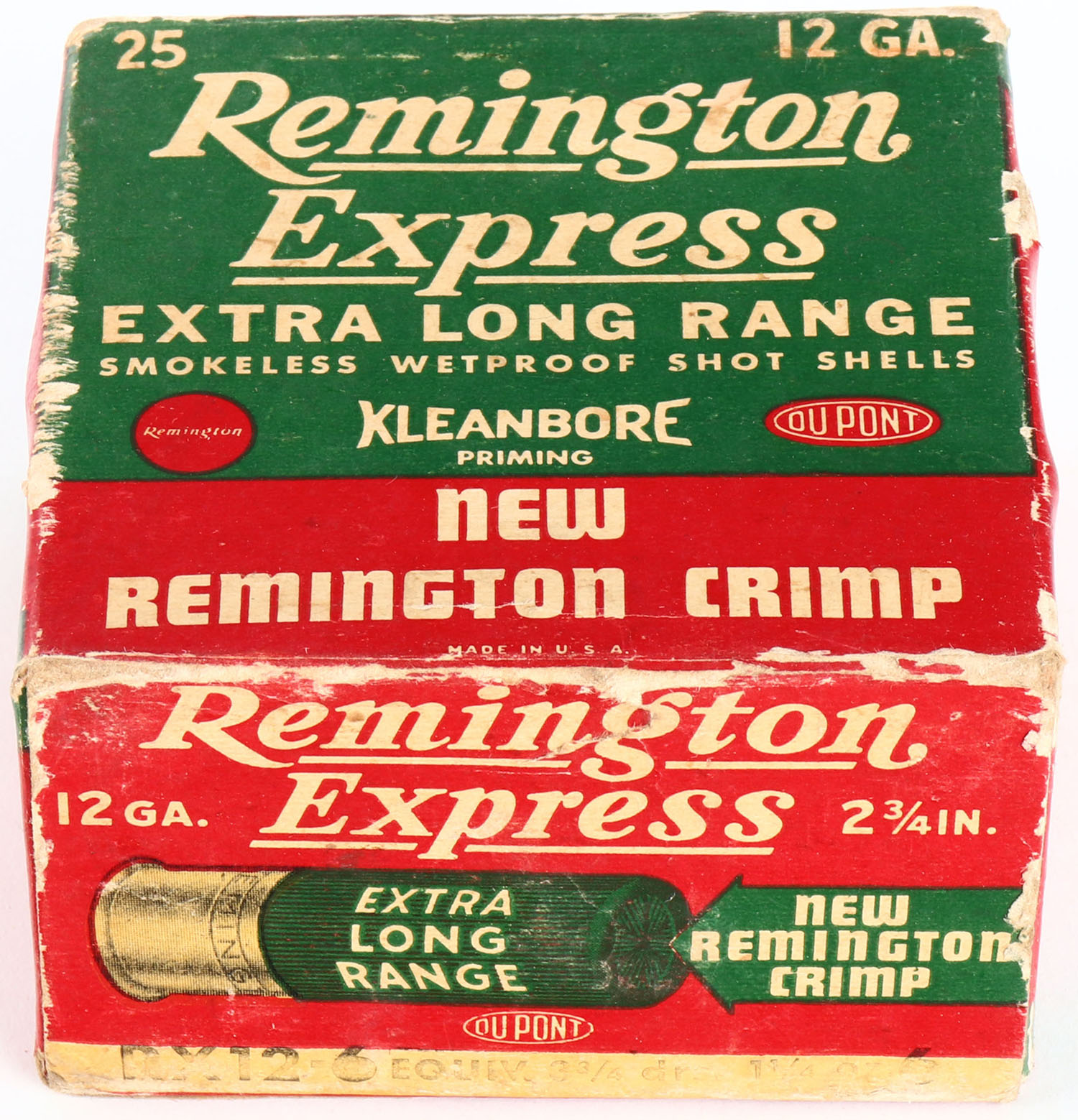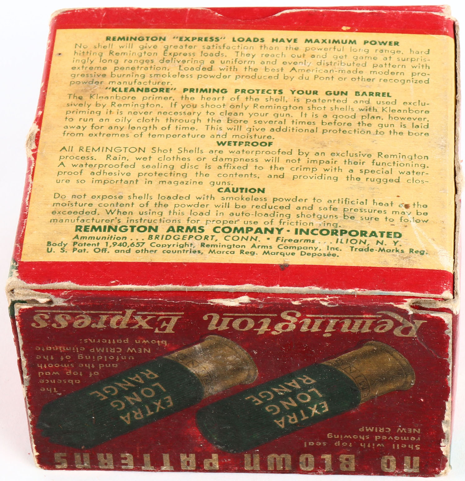 Remington Express, Extra Long Range with Insert, 12ga., 2 3/4'', 1pc., Full, shot size 6, box is white, yellow, red and green, box has edge wear & soiling with nice colors, shells are very good. Grade: Very Good + - Value: 10 to 40