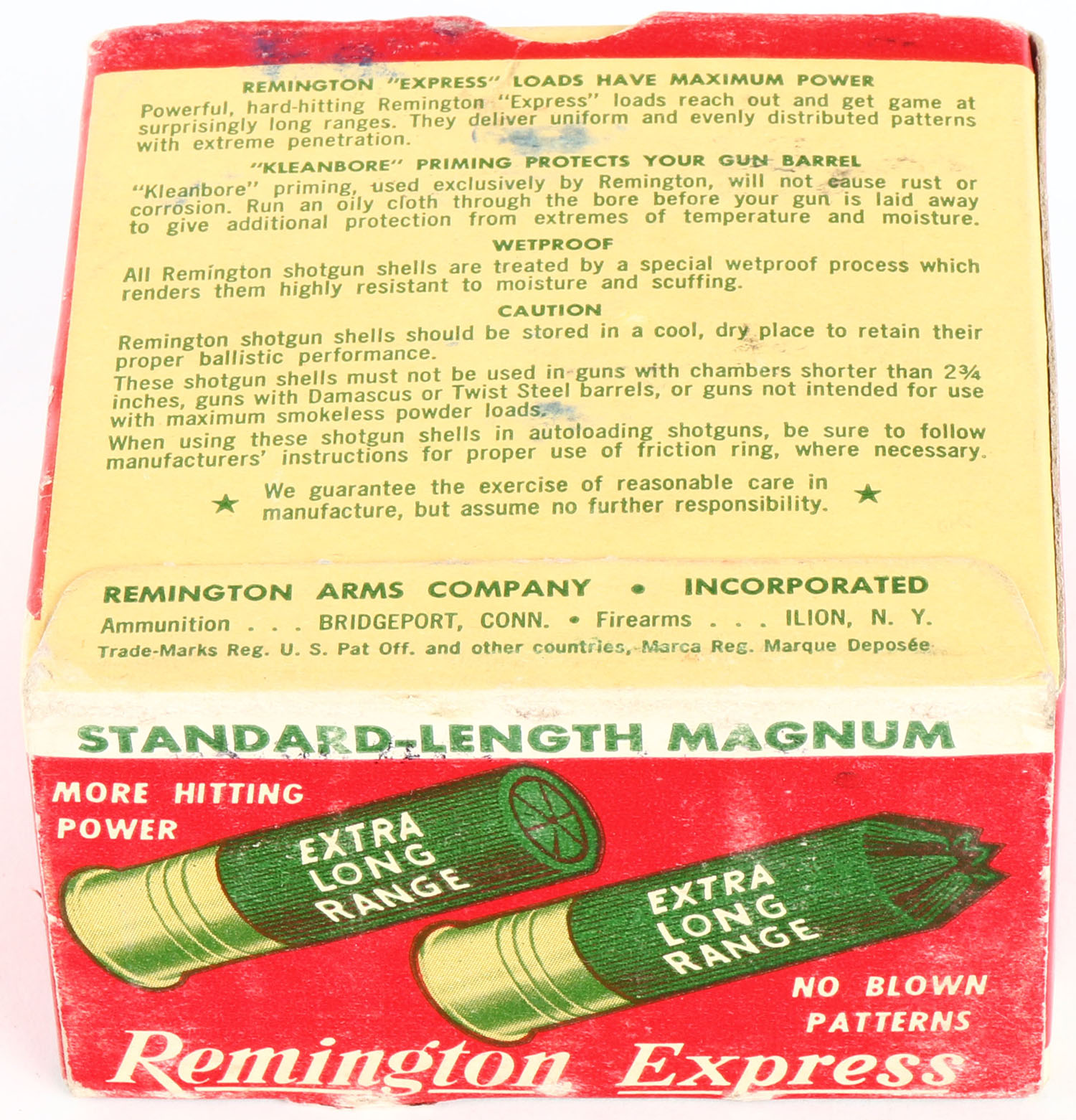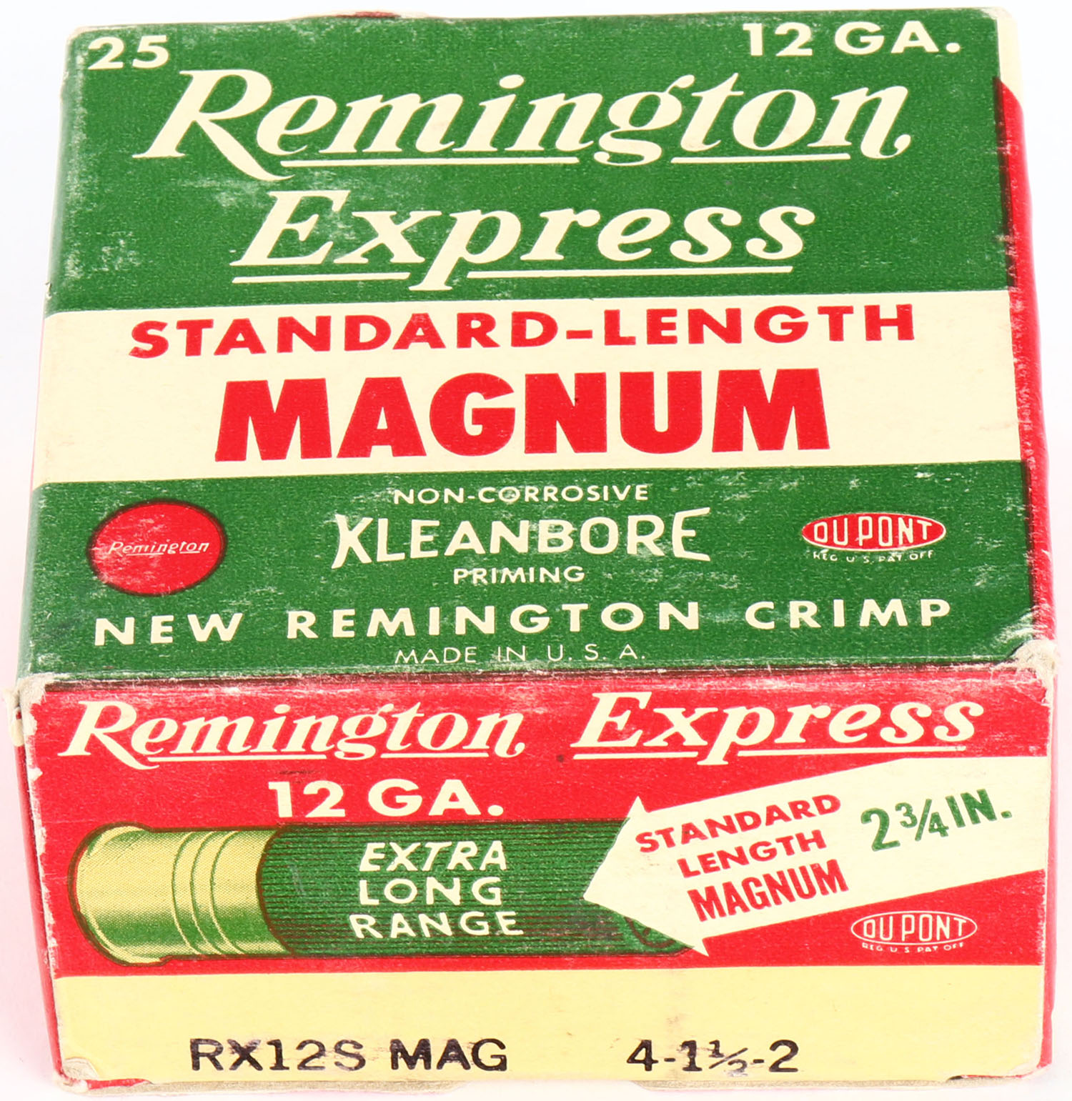 Remington Express, Standard-Length Magnum, 12ga., 2 3/4'', 1pc., Full, shot size 2, box is white, yellow, red and green, box has light edge wear & light soiling with very nice colors, shells are very good. Grade: Very Good ++ - Value: 10 to 40