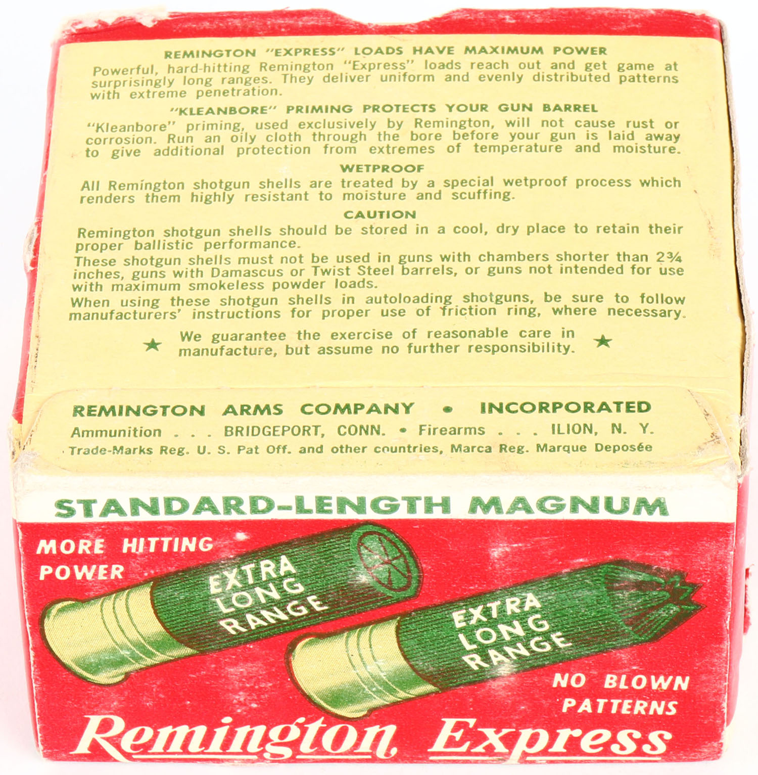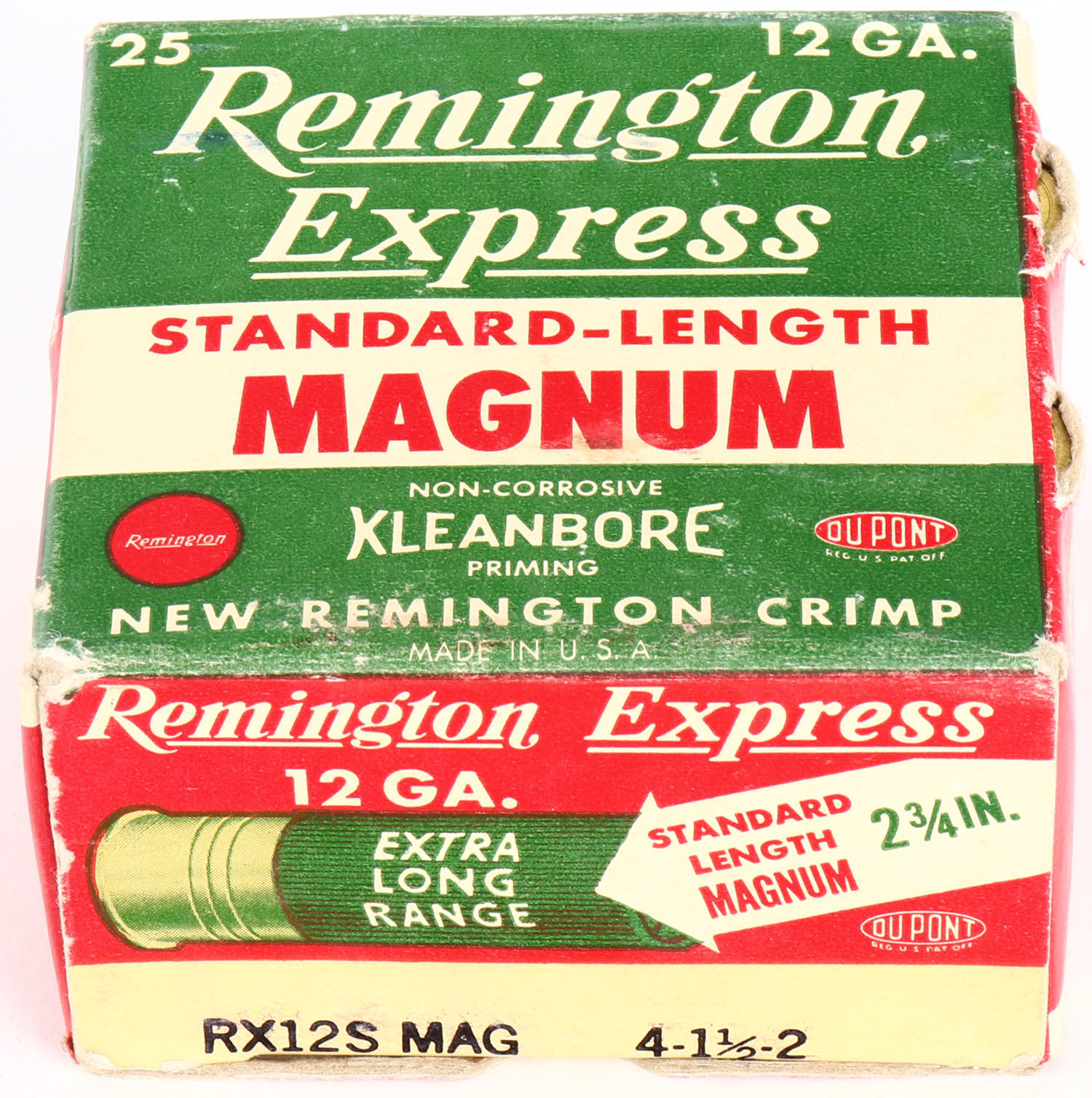 Remington Express, Standard-Length Magnum, 12ga., 2 3/4'', 1pc., Full, shot size 2, box is white, yellow, red and green, box has shell protrusion, light edge wear & light scuffing with very nice colors, shells are excellent. Grade: Very Good ++ - Value: 10 to 40