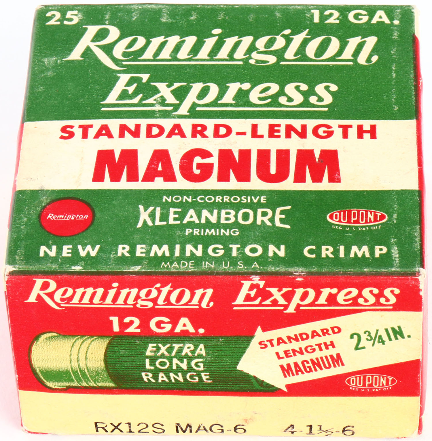 Remington Express, Standard-Length Magnum, 12ga., 2 3/4'', 1pc., Full, shot size 6, box is white, yellow, red and green, box has light edge wear & light soiling with very nice colors, shells are very good. Grade: Very Good ++ - Value: 10 to 40