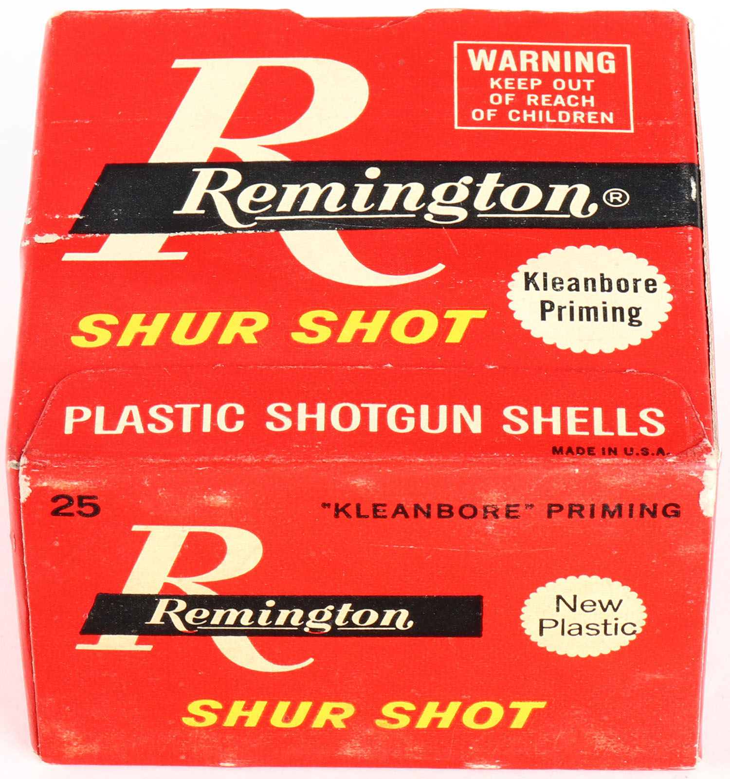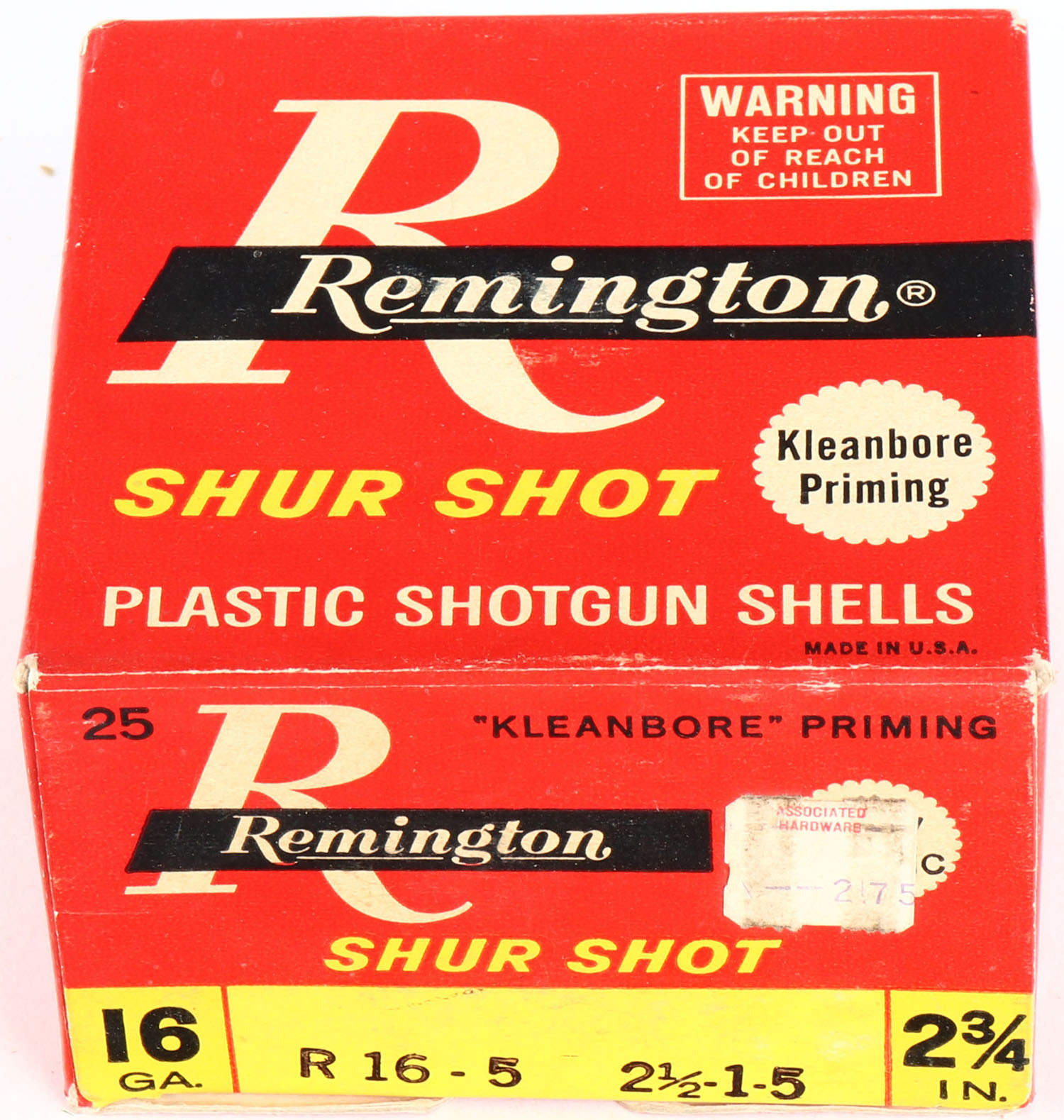 Remington Shur Shot, 16ga., 2 3/4'', 1pc., Full, shot size 5, box is white, yellow, red and black, box is solid with very nice colors, shells are excellent. Grade: Very Good ++ - Value: 10 to 30