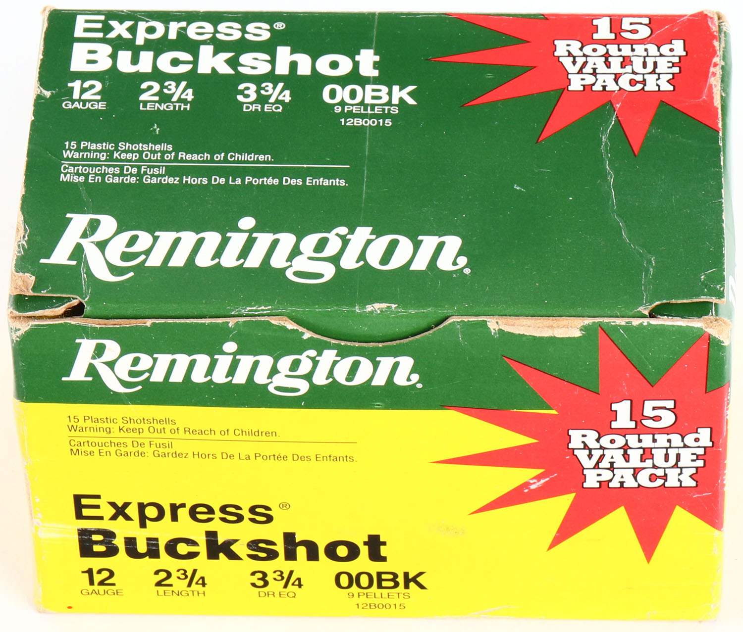 Remington Express Buckshot, 12ga., 2 3/4'', 1pc., Full, shot size 00BK, multi-colored box, box is solid with very nice colors, shells are excellent. Grade: Very Good ++ - Value: 10 to 30