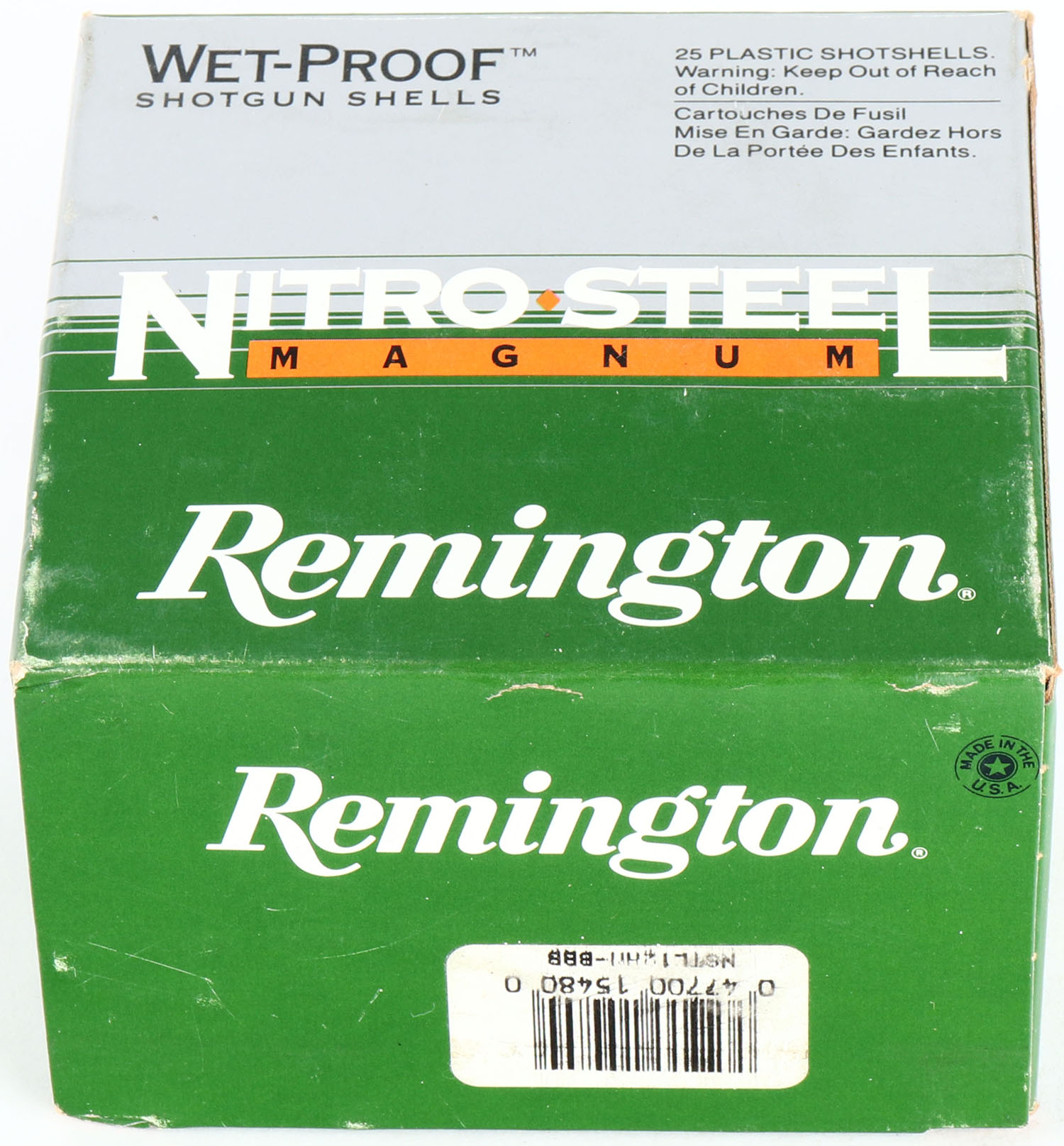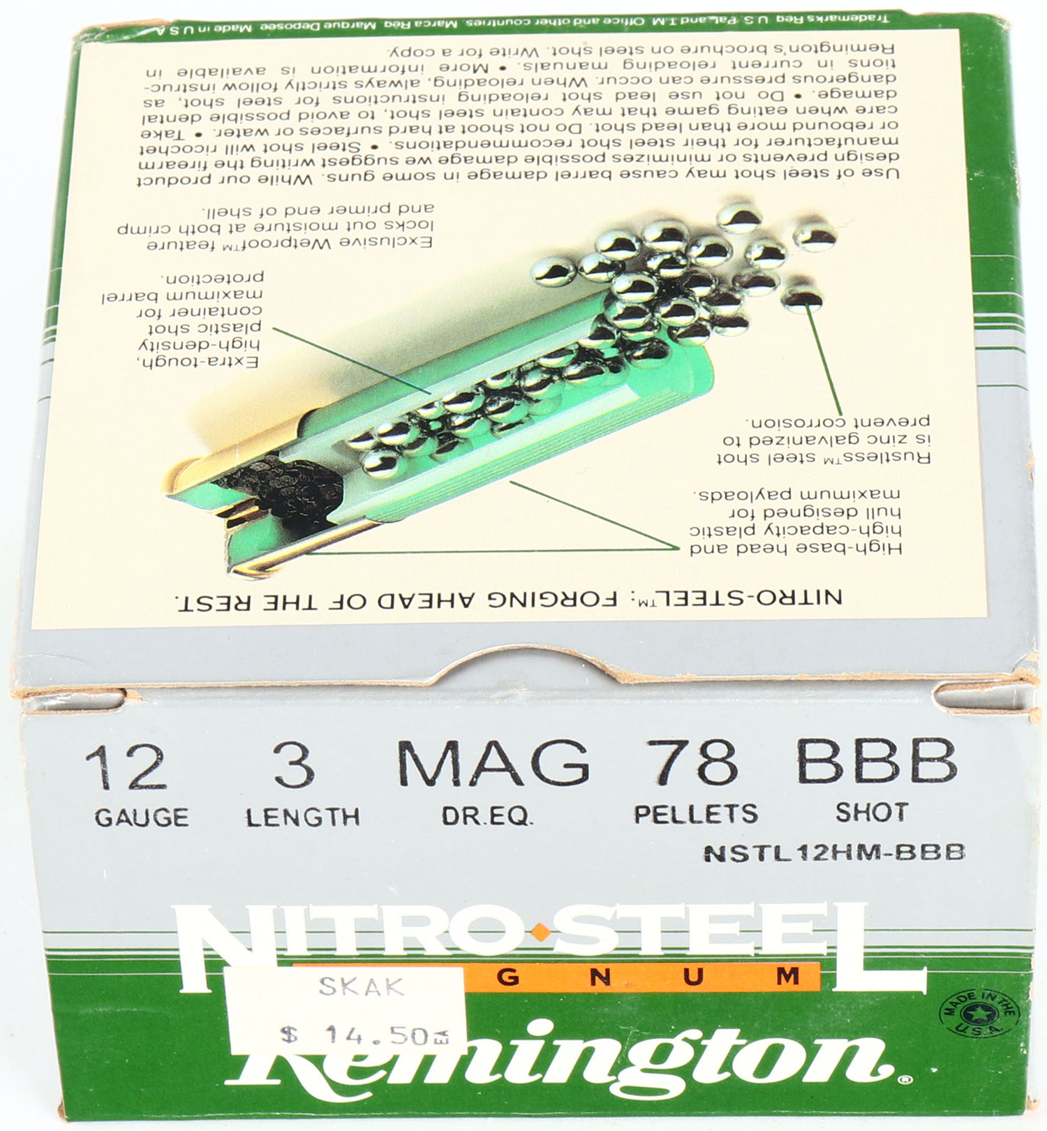 Remington Nitro Steel Magnum, 12ga., 3'', 1pc., Full, shot size BBB, multi-colored box, box is solid with very nice colors, shells are excellent. Grade: Excellent - Value: 10 to 30