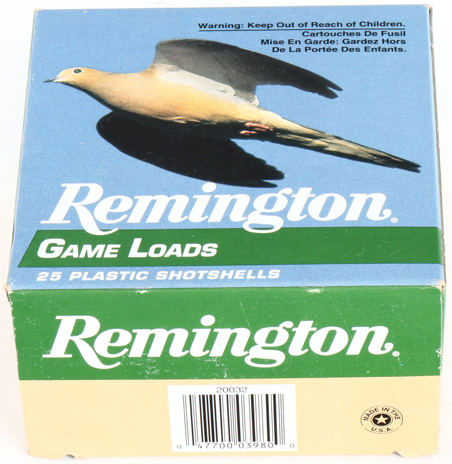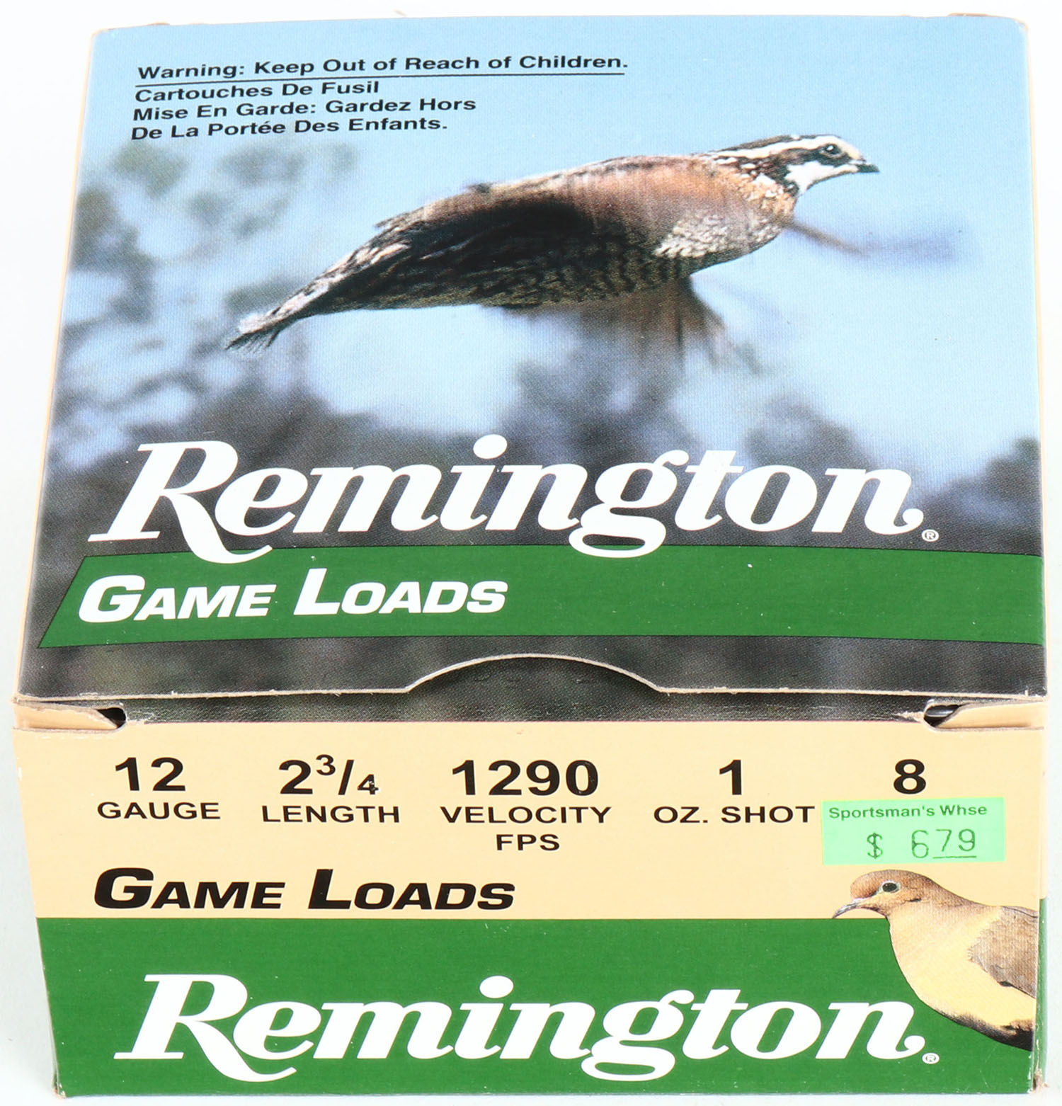 Remington Game Loads, 12ga., 2 3/4'', 1pc., Full, shot size 8, multi-colored box, box is very solid with great colors, shells are excellent. Grade: Excellent ++ - Value: 10 to 30