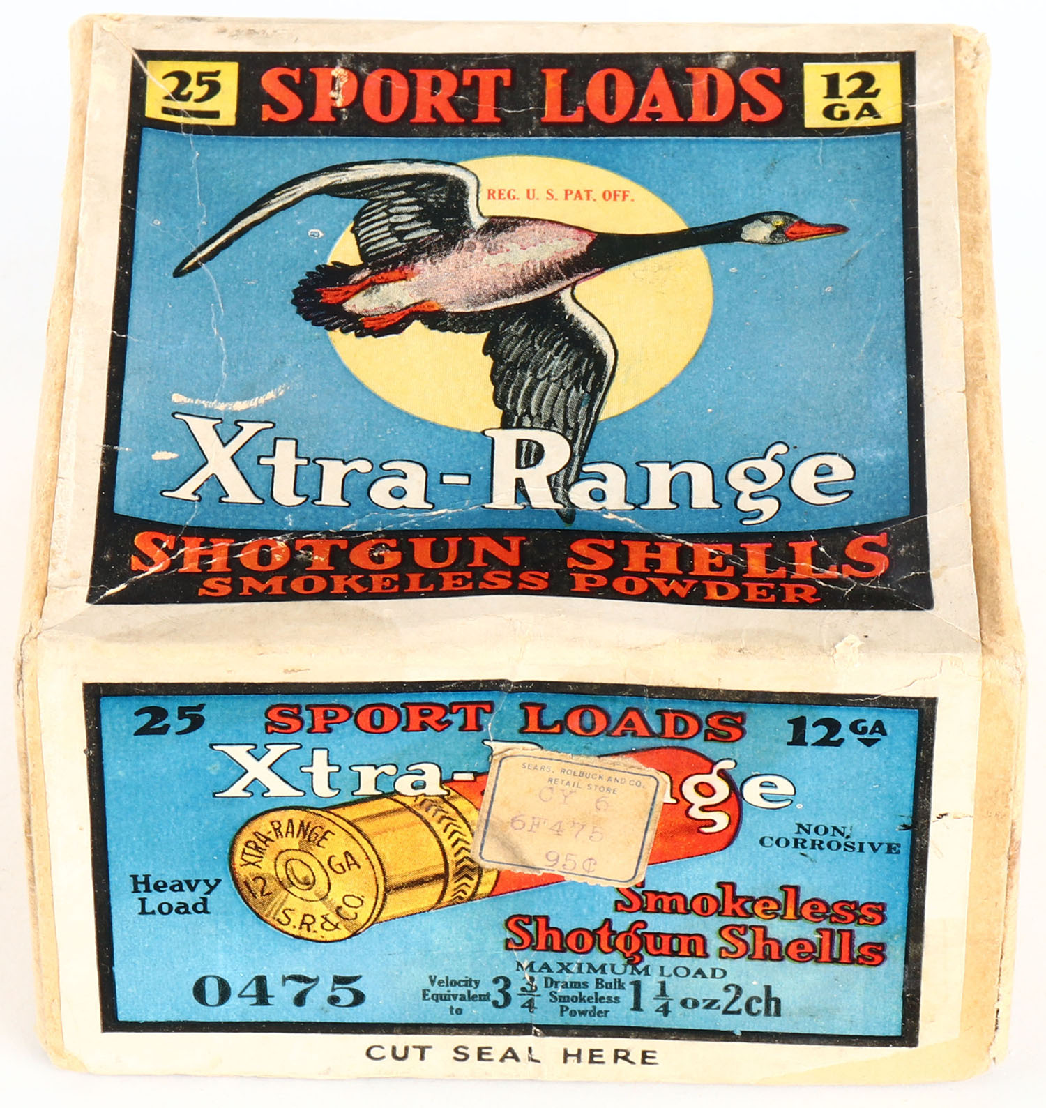 Sears Roebuck & Co., Sports Loads, XTRA-RANGE, 12ga., 2pc., Empty, shot size 2 Ch, buff box with multi colored label that pictures a Goose flying with a yellow moon in background, box has light soiling, light edge wear & light scuffing with very nice colors. Grade: Very Good ++ - Value: 60 to 200