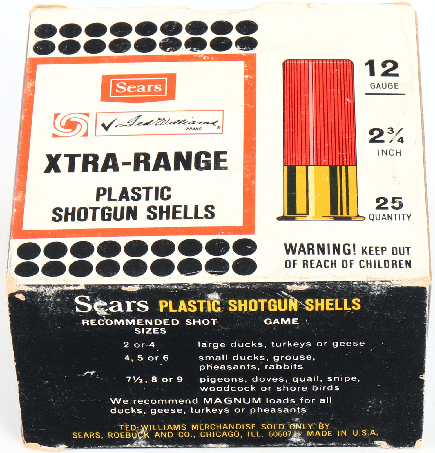 Sears, Xtra-Range, 12ga., 1pc., Full, Shot Size 4, box has light edge wear & very nice colors, shells are excellent. Grade: Very Good ++ - Value: 10 to 30