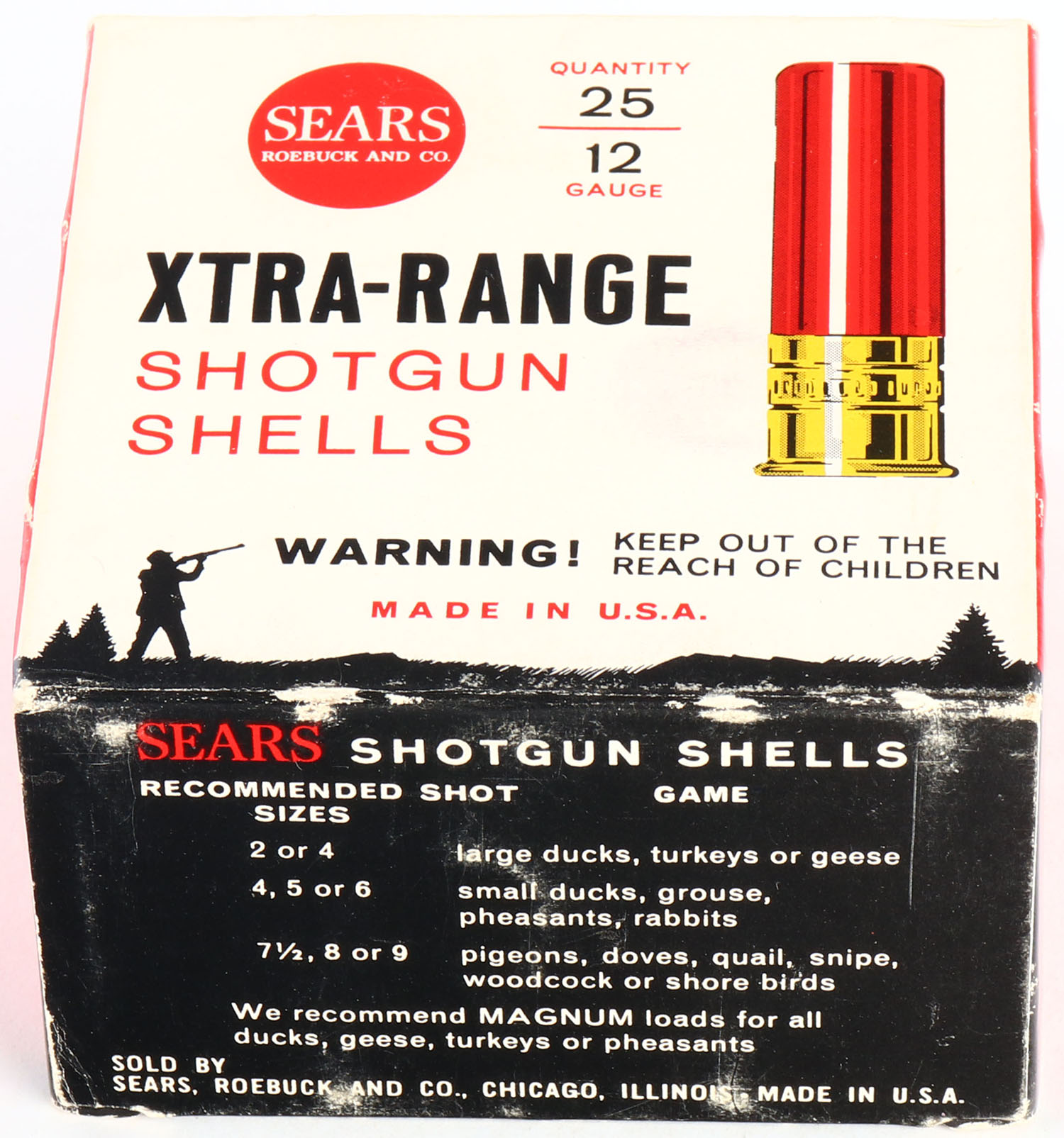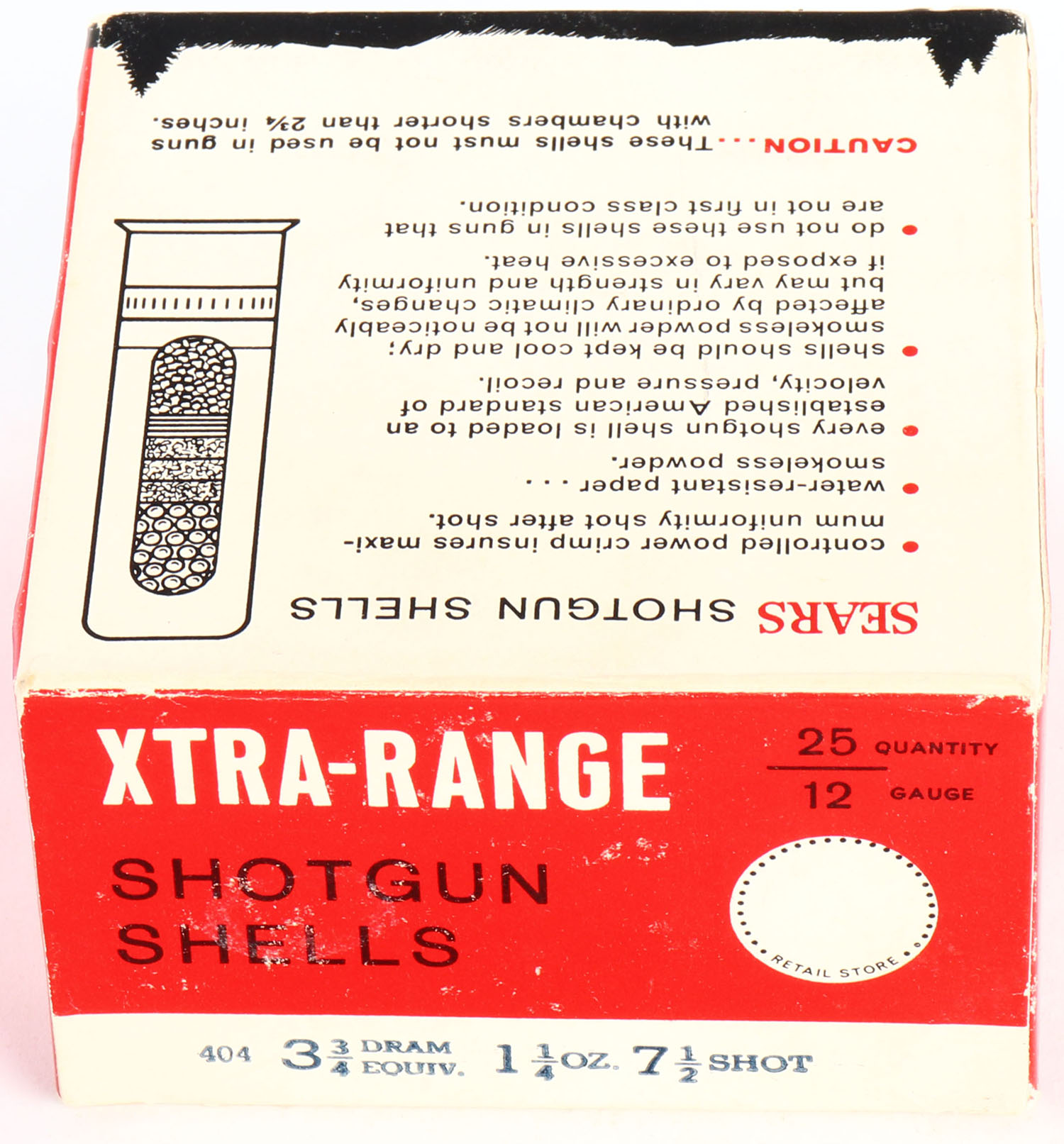 Sears, Xtra-Range, 12ga., 1pc., Full, Shot Size 7 1/2, box is very solid with light edge wear & great colors, shells are excellent. Grade: Excellent + - Value: 10 to 30