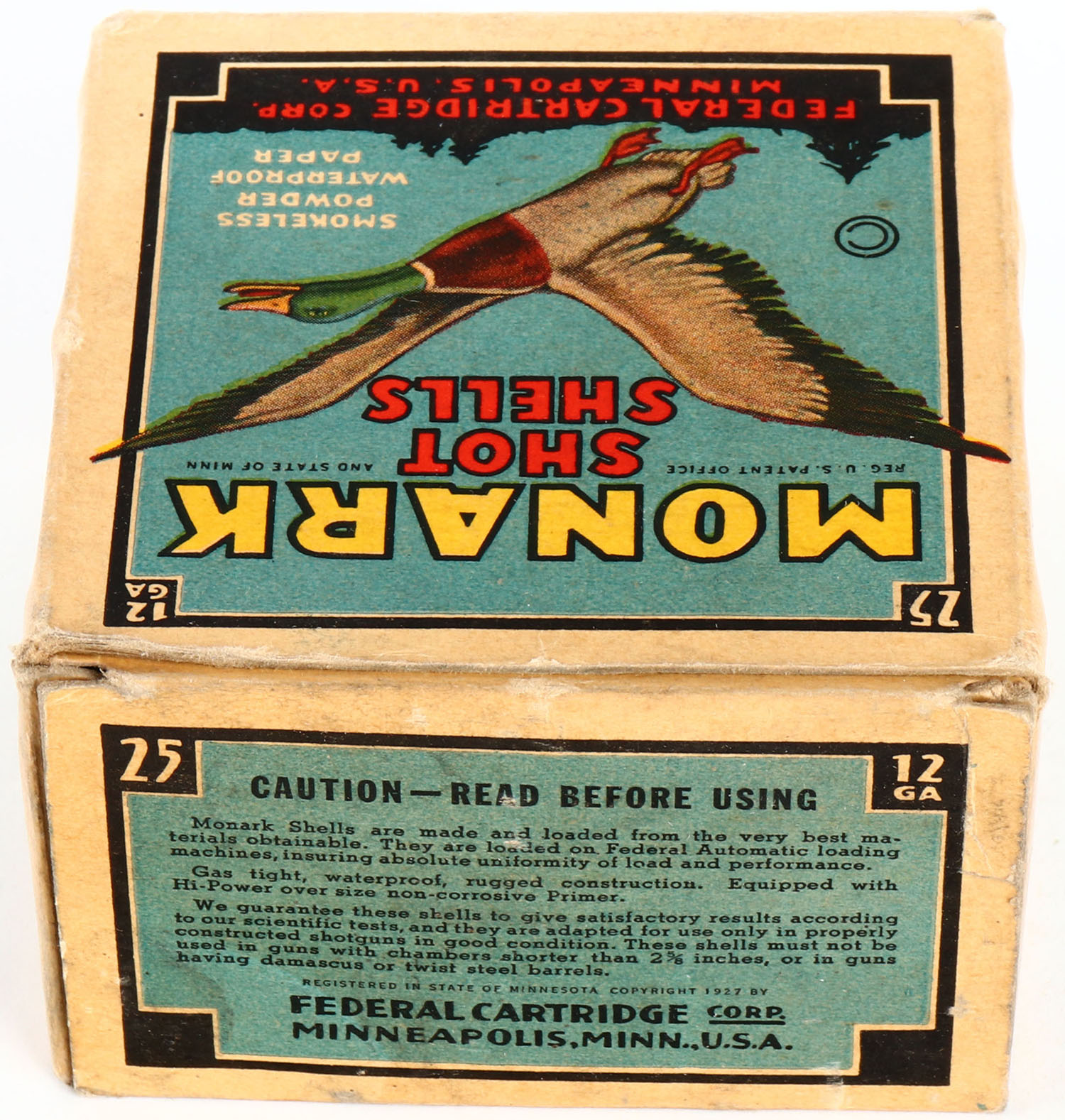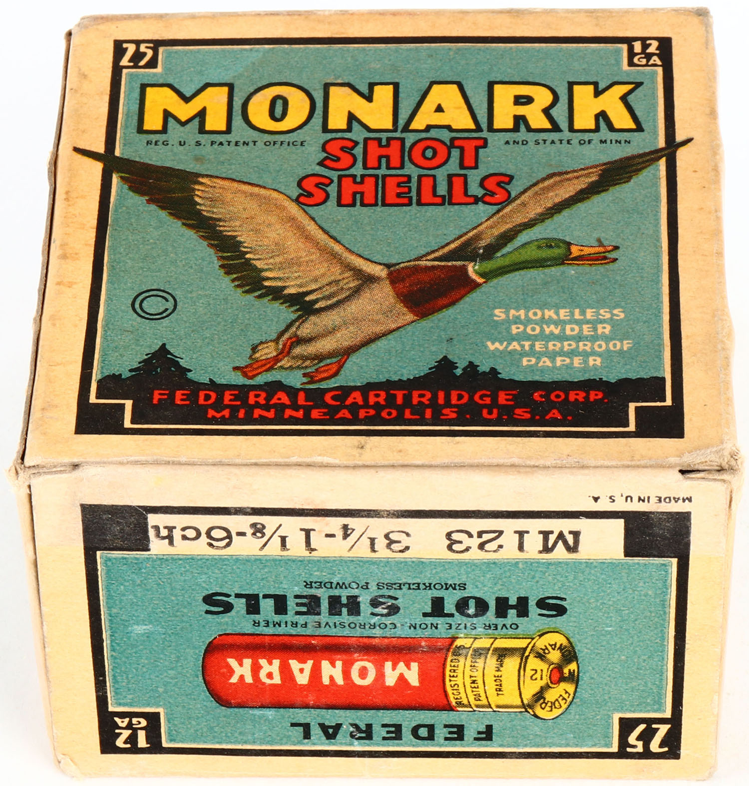 Federal Cart. Co., MONARK, 12ga., 1pc., Full, shot size 6ch, Black border, blue, yellow and red box with flying mallard, box has light soiling with nice color, Shells are very good. Grade: Very Good ++ - Value: 10 to 40