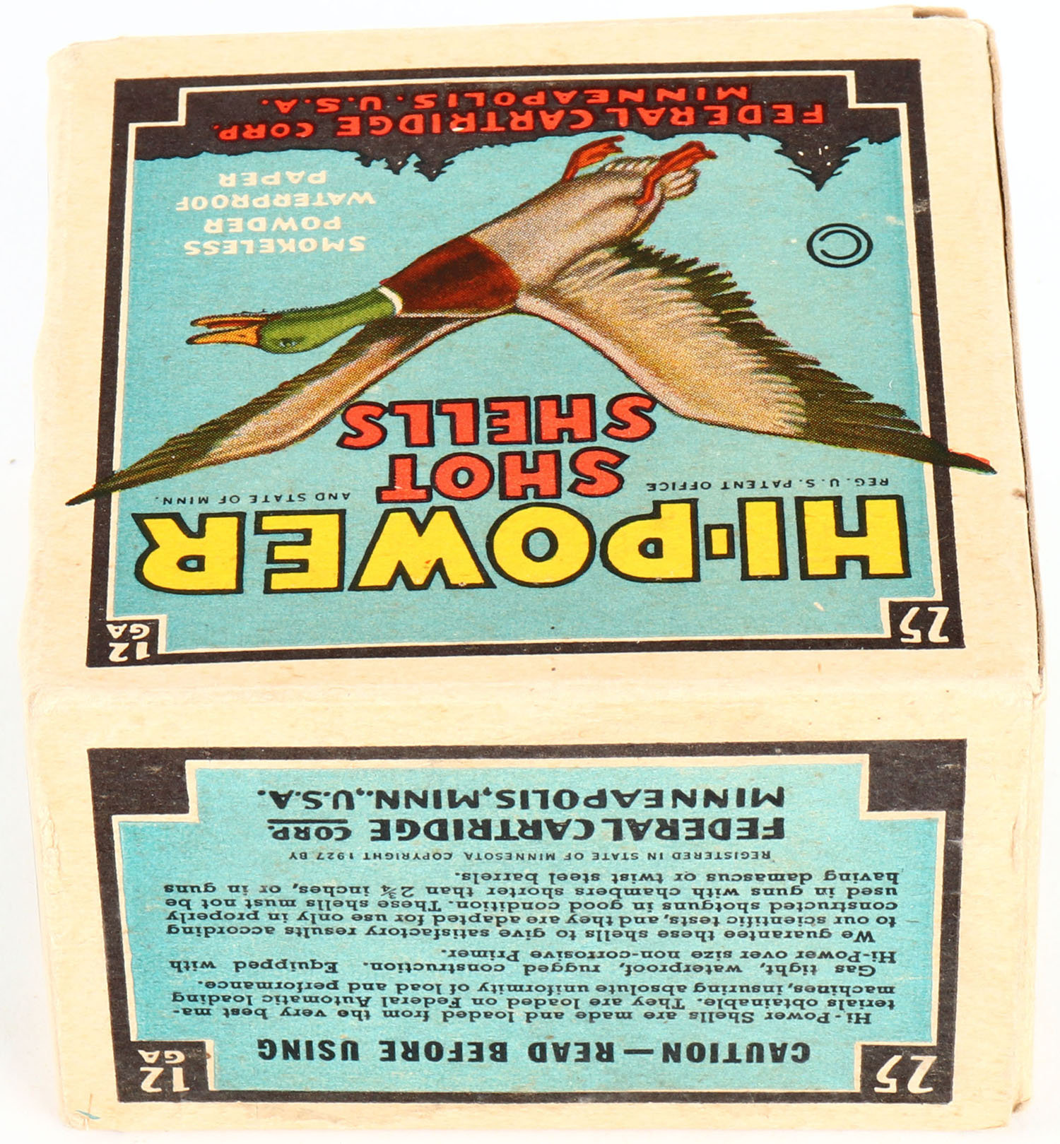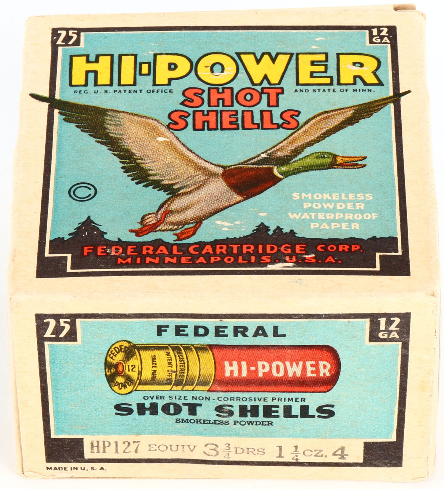 Federal Cart. Co., HI-POWER, 12ga., 1pc., Full, shot size 4, Black border, blue, yellow and red box with flying mallard, box is very solid with great colors, Shells are excellent. Grade: Excellent - Value: 10 to 40