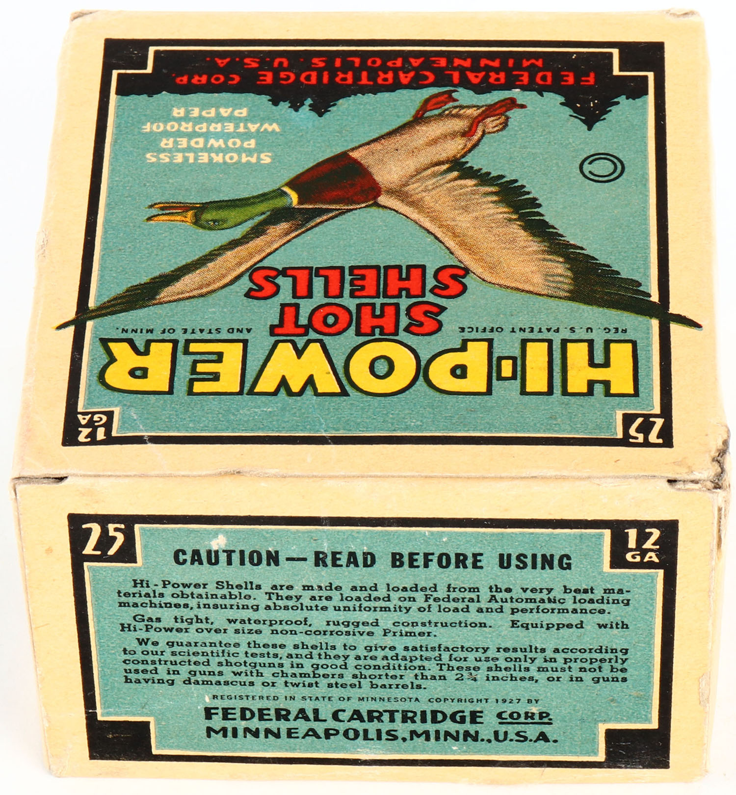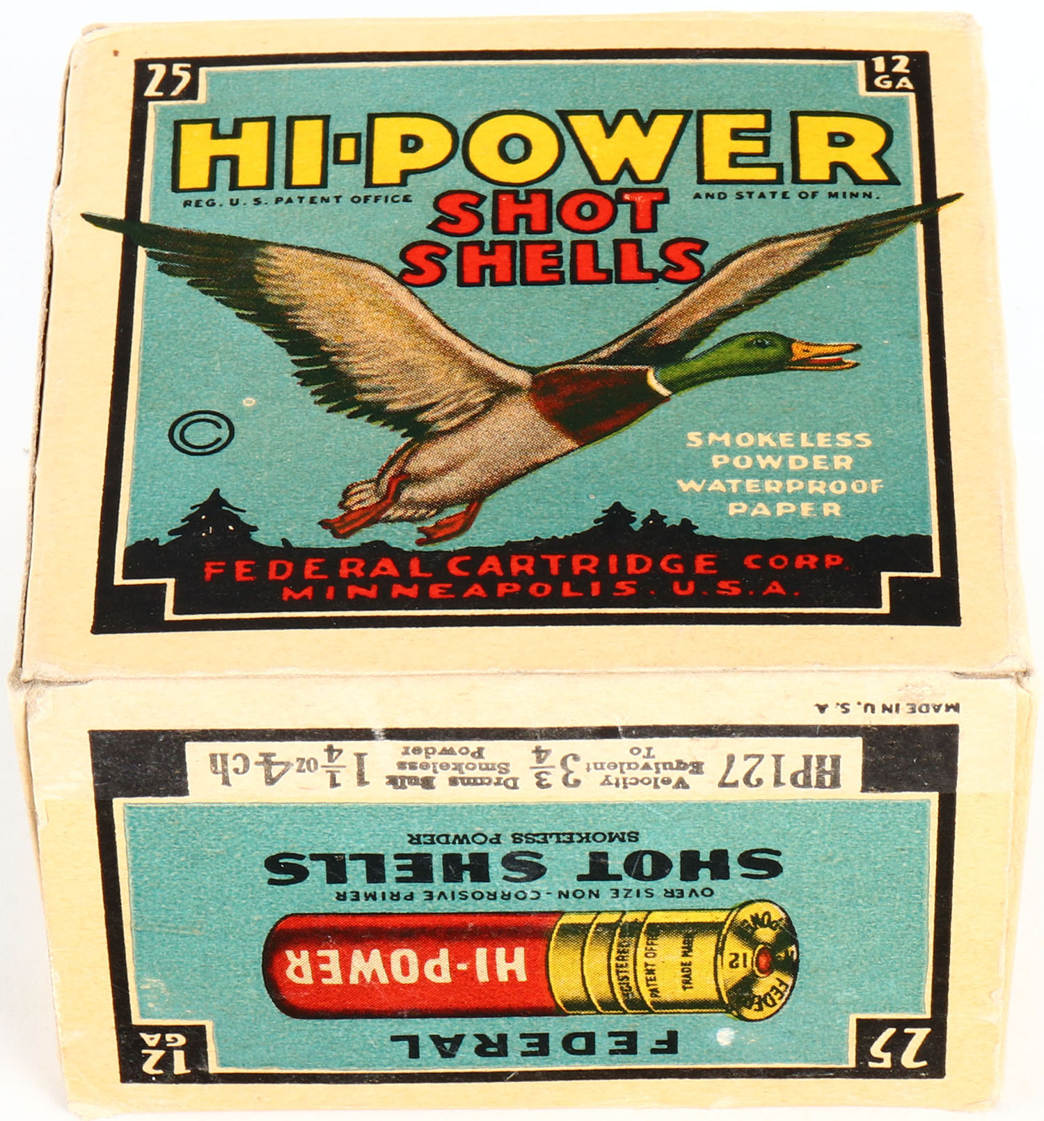 Federal Cart. Co., HI-POWER, 12ga., 1pc., Full, shot size 4ch, Black border, blue, yellow and red box with flying mallard, box is very solid with great colors, Shells are very good. Grade: Excellent - Value: 10 to 40