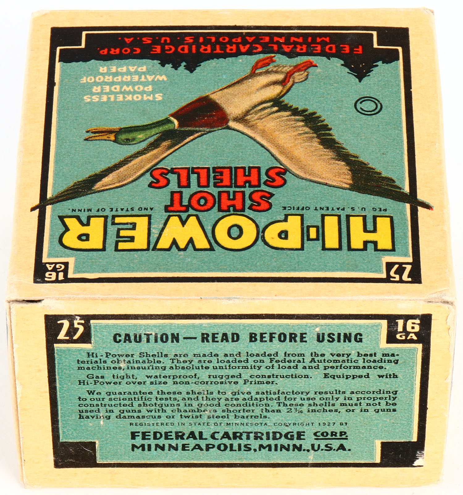 Federal Cart. Co., HI-POWER, 16ga., 1pc., Full, shot size 6ch, Black border, blue, yellow and red box with flying mallard, box has light scuffing & light soiling with very nice colors, Shells are excellent. Grade: Very Good ++ - Value: 10 to 40