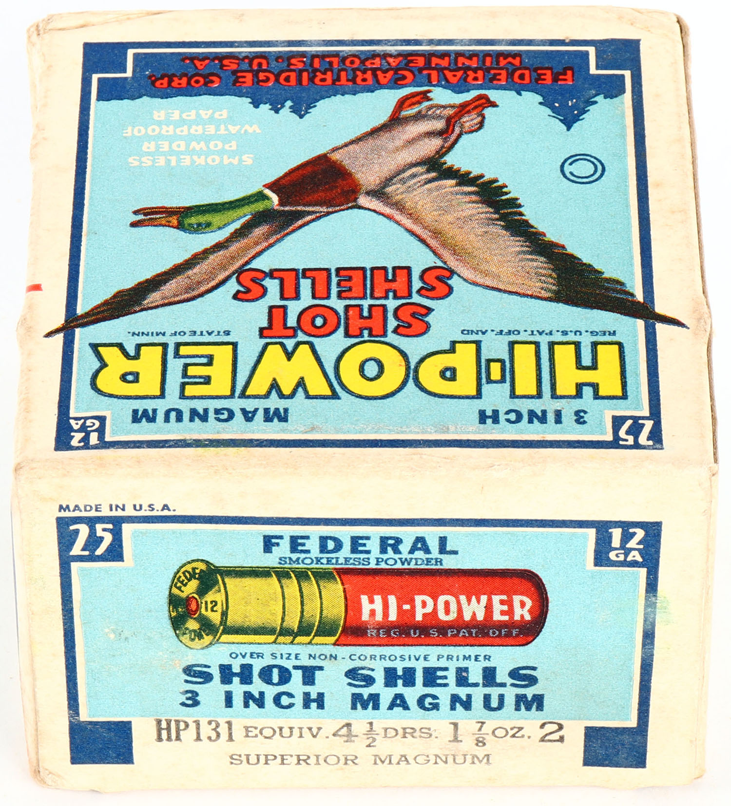 Federal Cart. Co., HI-POWER, 12ga., 1pc., Full, shot size 2 Superior Magnum, Blue border, blue, yellow and red box with flying mallard, box has light edge wear & light soiling with very nice colors, Shells are very good. Grade: Very Good ++ - Value: 10 to 50