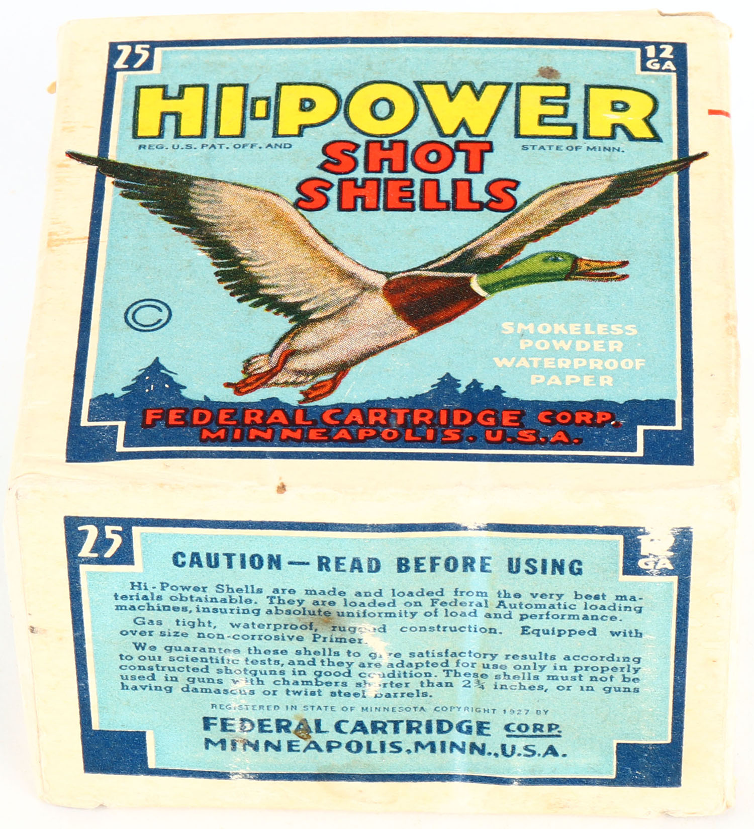 Federal Cart. Co., HI-POWER, 12ga., 1pc., Full, shot size 4 Maximum Load, Blue border, blue, yellow and red box with flying mallard, box has light scuffing & light soiling with very nice colors, Shells are excellent. Grade: Very Good ++ - Value: 10 to 50