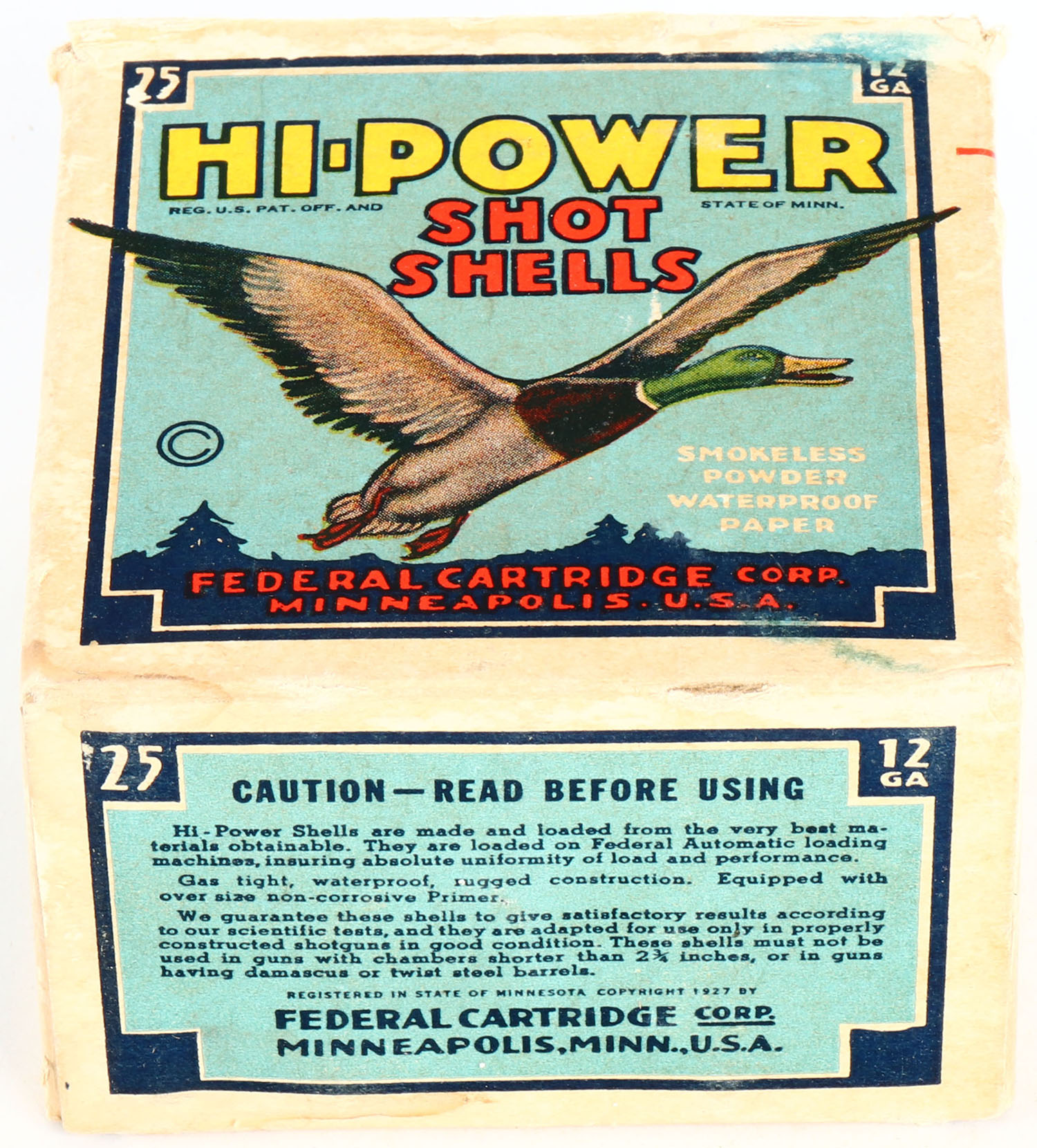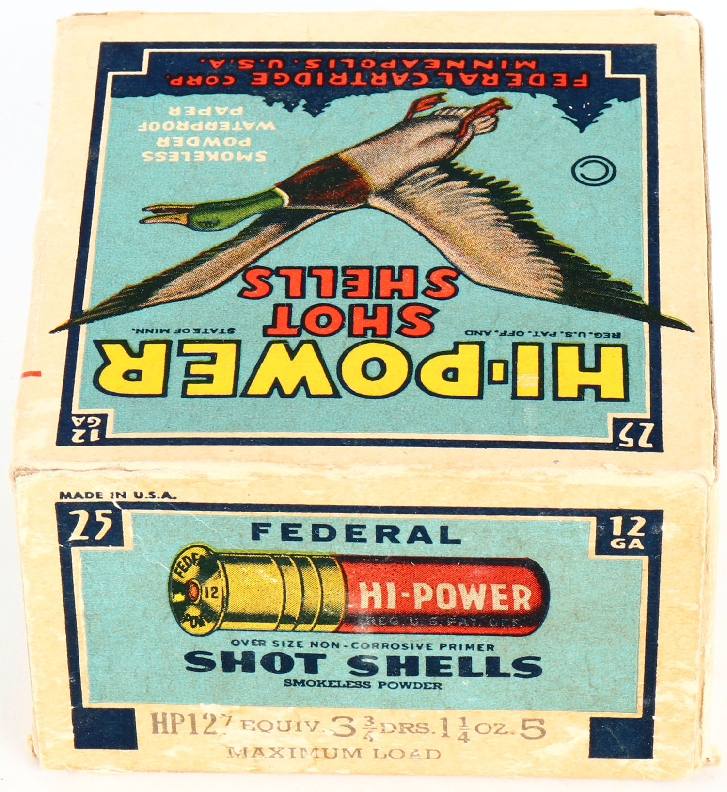Federal Cart. Co., HI-POWER, 12ga., 1pc., Full, shot size 5 Maximum Load, Blue border, blue, yellow and red box with flying mallard, box has edge wear & soiling with very nice colors, Shells are excellent. Grade: Very Good ++ - Value: 10 to 50