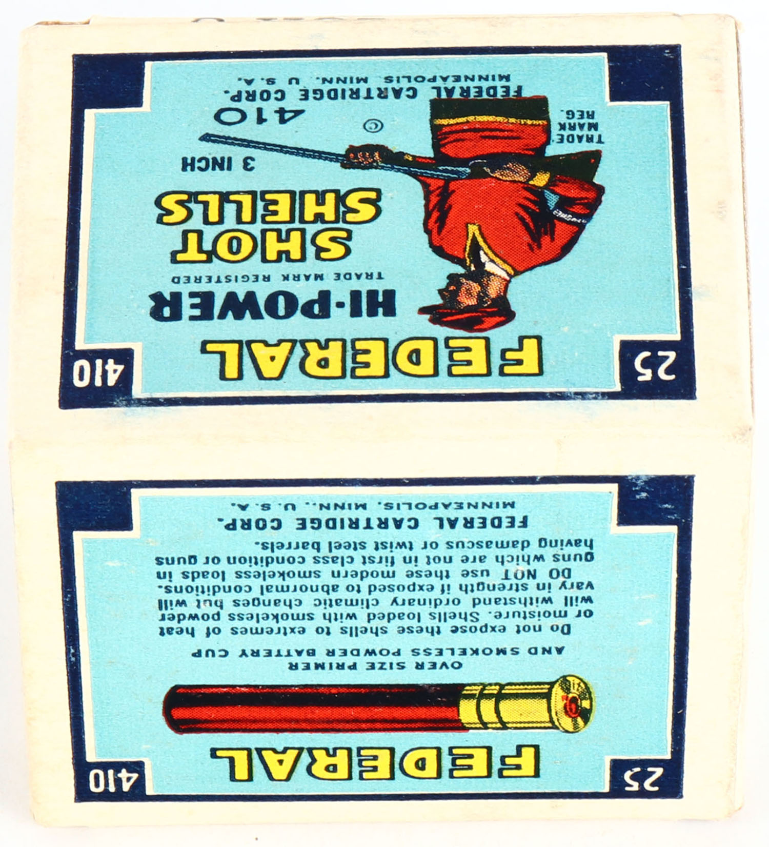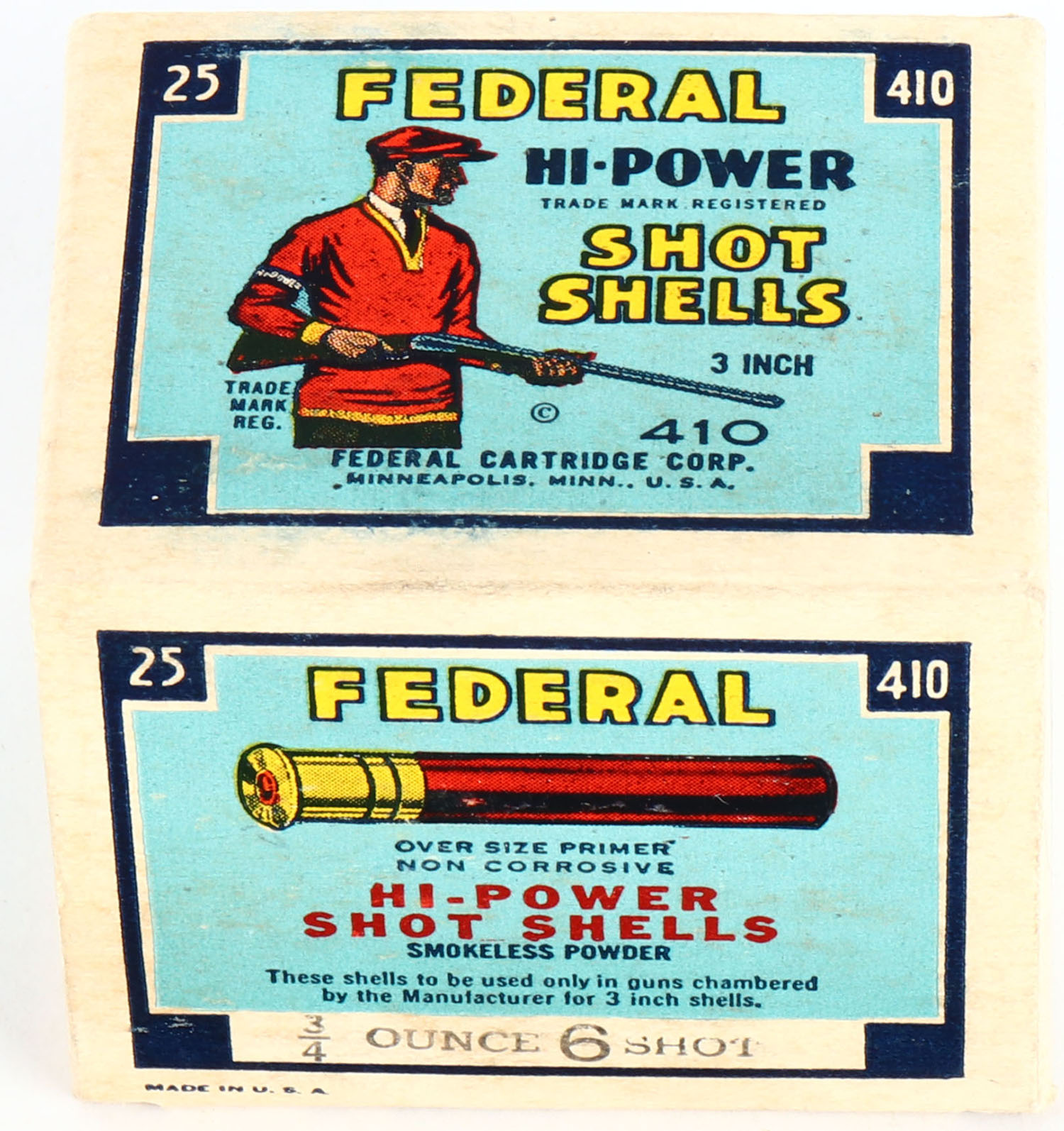 Federal Cart. Co., HI-POWER, 410ga., 3'', 1pc., Full, shot size 6, Blue border, blue, yellow and red box with Trap Shooter, box has very light soiling with great colors, Shells are excellent. Grade: Excellent + - Value: 20 to 80
