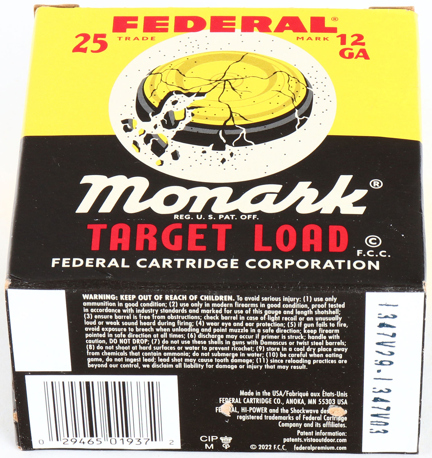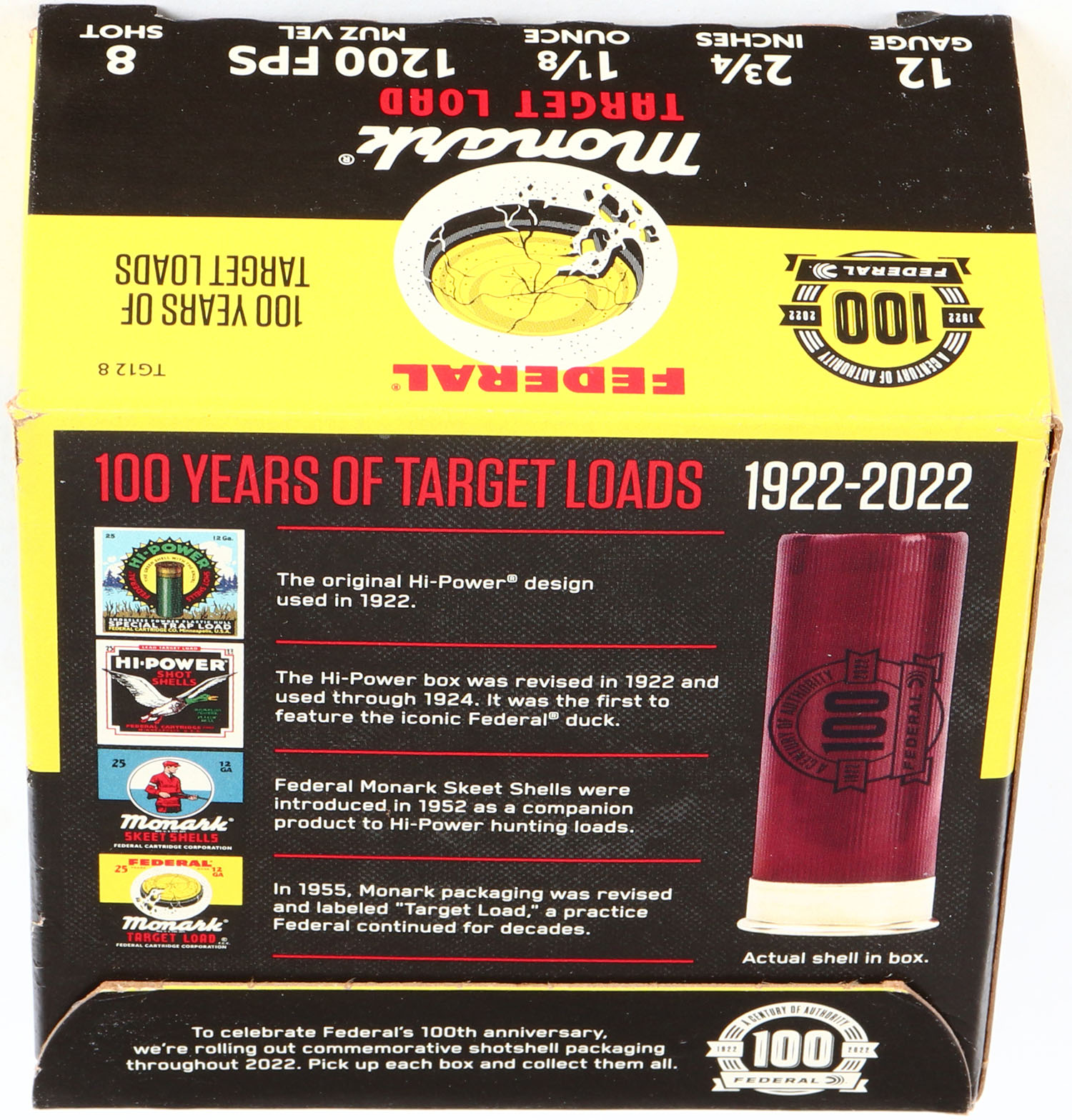 Federal Cart. Co., Monark 100 Year Anniversary, 12ga., 2 3/4'', 1pc., Full, shot size 8 Target Load, black, yellow and red box with Trap that has shot all around, box very solid with Minty color box shows earlier boxes and when they were introduced also tells little story about Federal, shells are Minty. Grade: Excellent ++ - Value: 20 to 80
