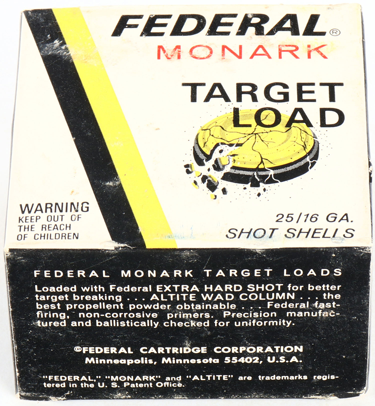 Federal, Monark, 16ga., 1pc., Full, shot size 7 1/2 Target Load, multi-colored box, box is solid, shells are excellent. Grade: Very Good ++ - Value: 10 to 30