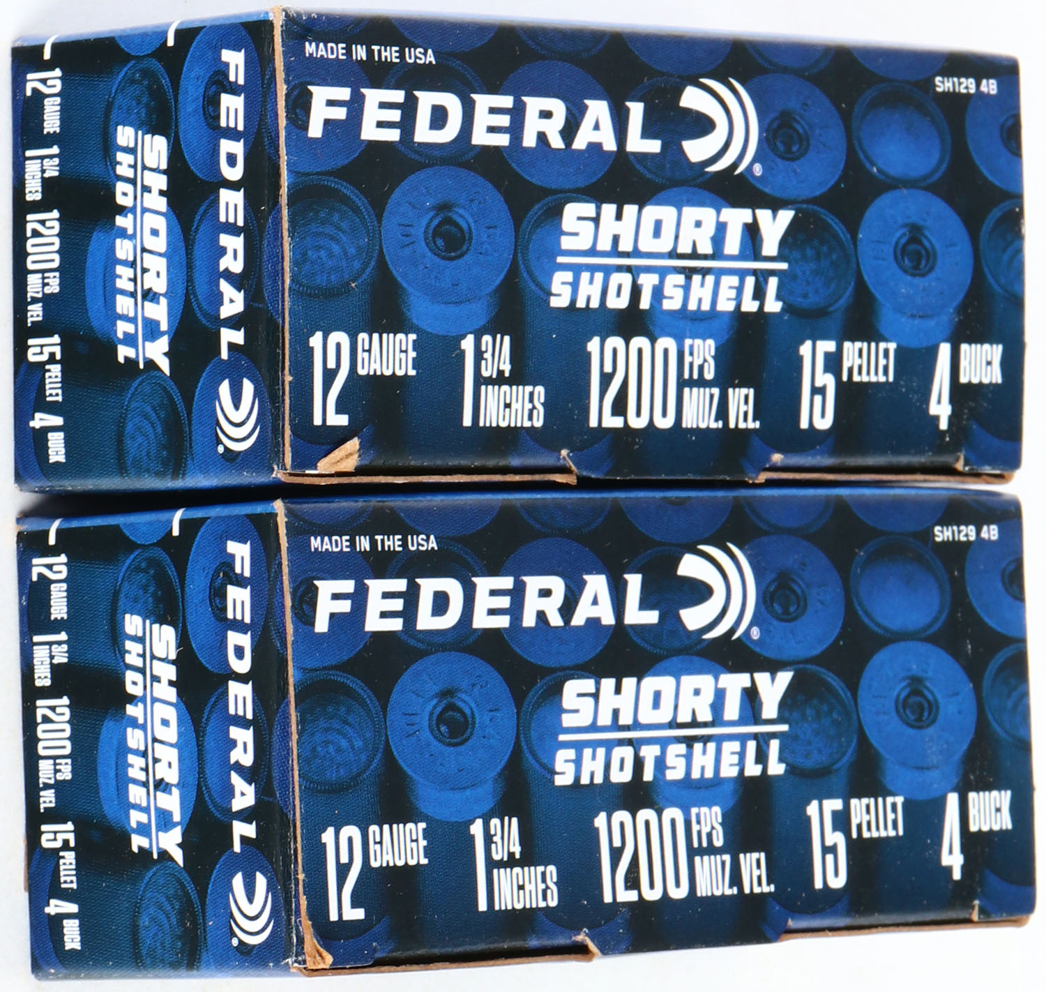 Federal, Shorty Shotshell, 12ga., 1 3/4'', 1pc., Full, shot size 4 Buck, multi-colored box, box is solid, shells are excellent. Grade: Excellent ++ - Value: 10 to 40