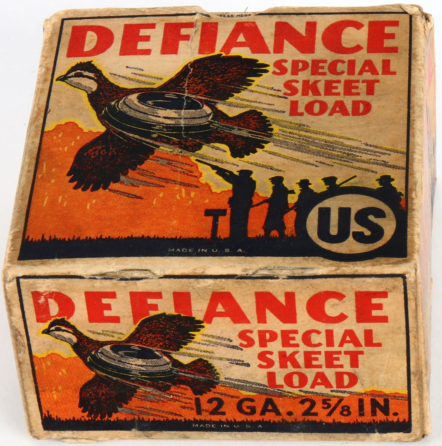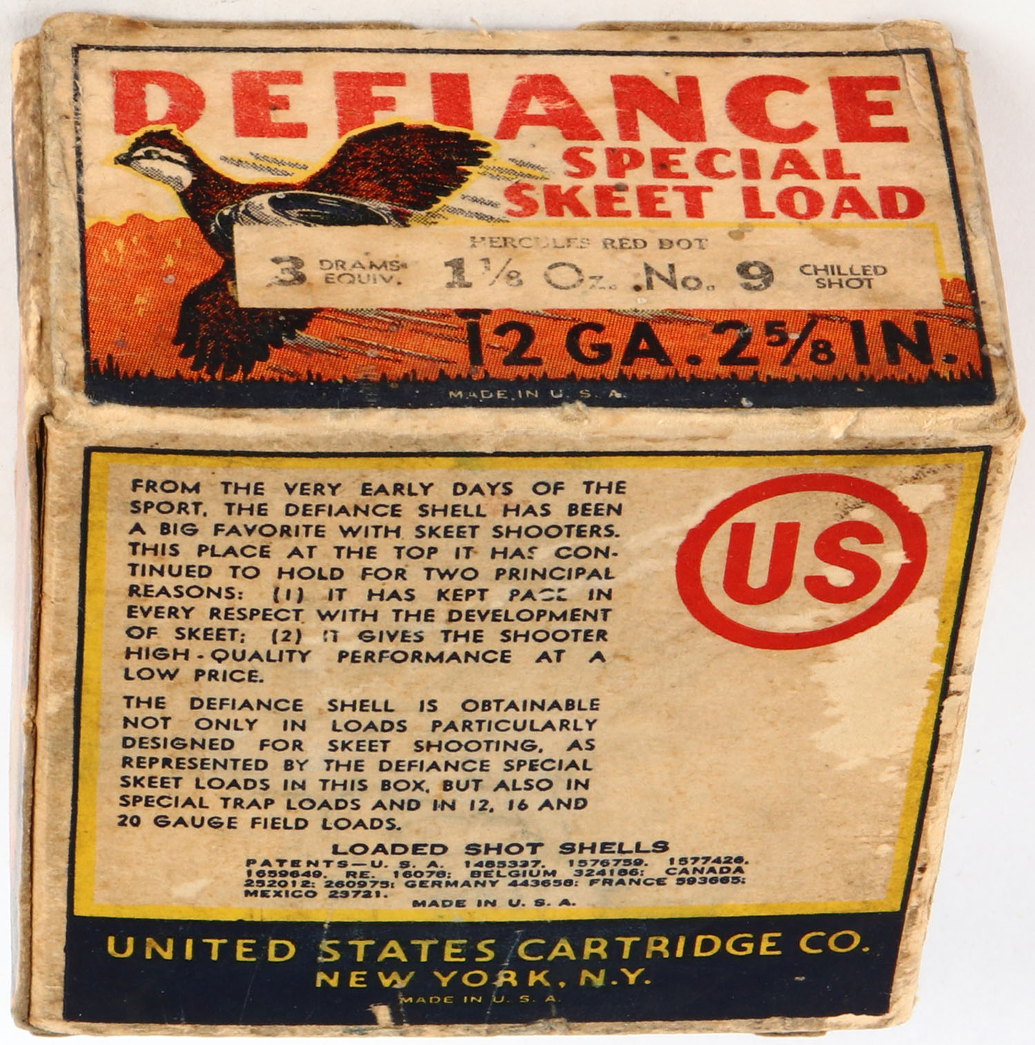 US Cart. Co., Defiance SPECIAL SKEET LOAD, 12ga., 1pc., Empty, shot size 9 Chilled, 2 5/8'', white, blue, black, orange and yellow box, nice graphics showing a quail in flight with skeet in body with shooters in background, box has soiling, light scuffing & light soiling with nice colors. Grade: Very Good ++ - Value: 400 to 2000