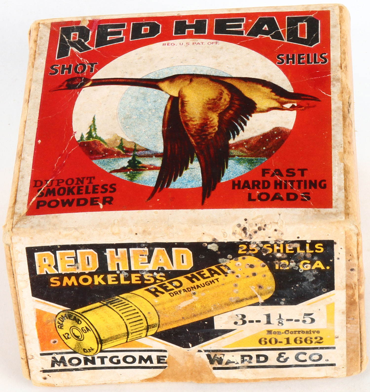 Montgomery Ward & Co., Red Head, DREADNAUGHT, 12ga., 2pc., Empty, shot size 5, buff box with multi colored scene & single goose flying, box has age soiling, edge wear & light scuffing with nice colors. Grade: Very Good ++ - Value: 40 to 200