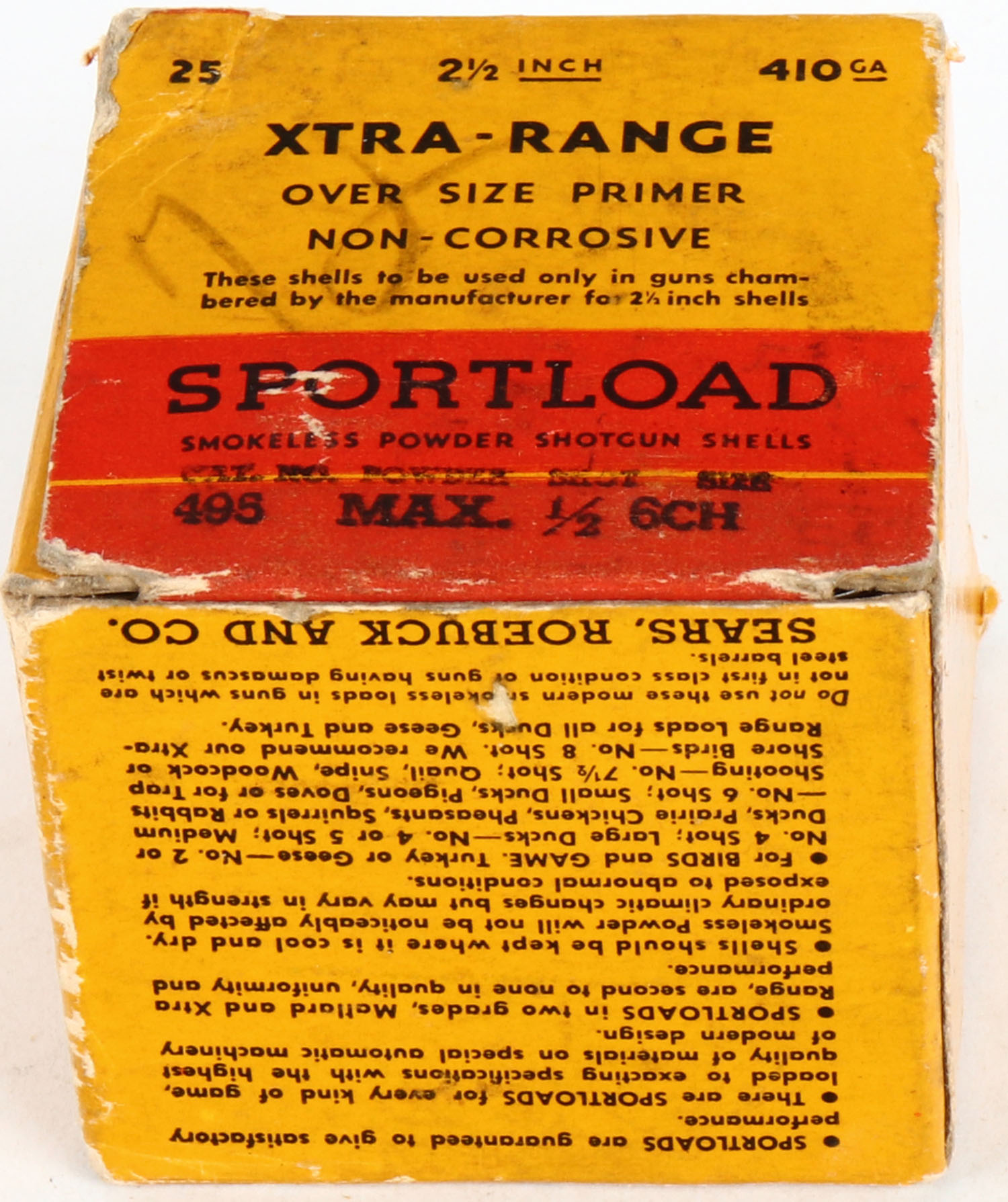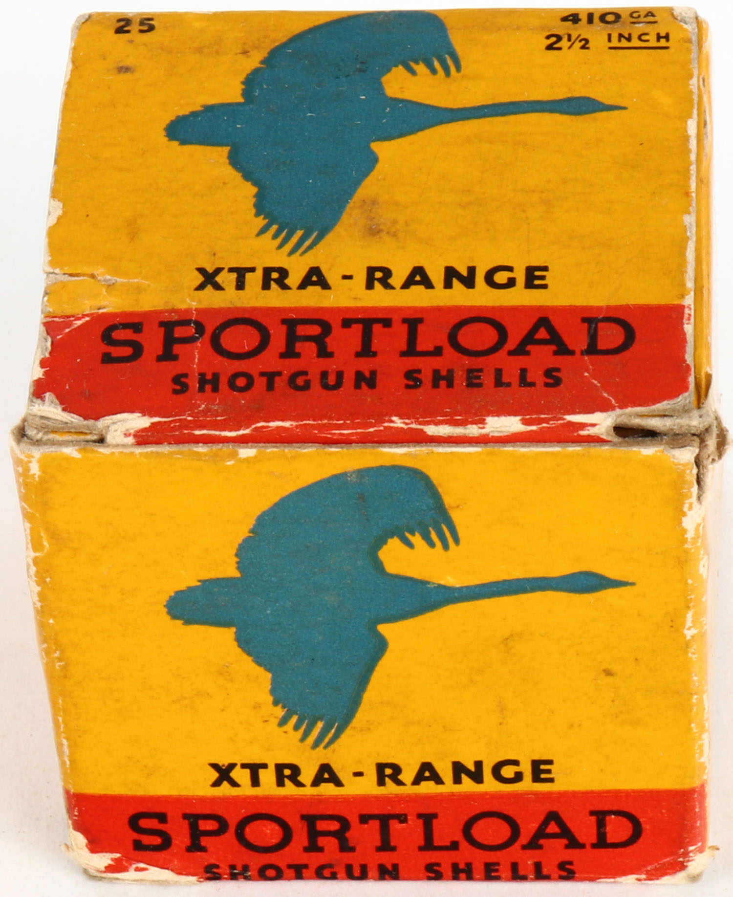 Sears Sportload, XTRA-RANGE, 410ga., 2 1/2'', 1pc., Full, shot size 6 CH, buff box with yellow, blue & red label that pictures a Goose in flight, box has edge wear & age soiling with nice color to label, shells are very good. Grade: Very Good ++ - Value: 40 to 200